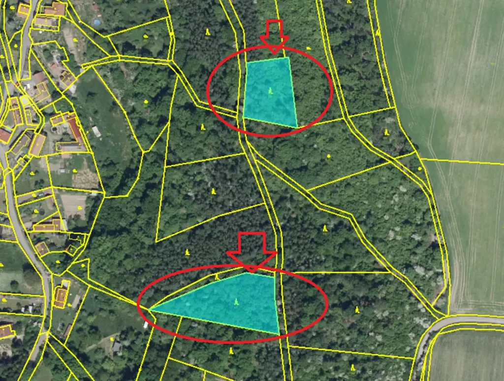 - p.č. 985 vedená jako lesní pozemek o celkové výměře 2 571 m2 (stáří lesa 42 let - zastoupení dřevin jasan, stáří lesa 38 let - zastoupení dřevin borovice)