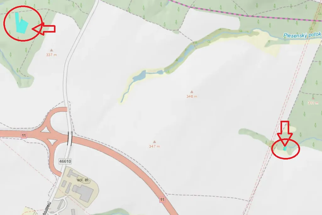 - p.č. 1411/8 vedená jako lesní pozemek o celkové výměře 214 m2 (stáří lesa 125 let - zastoupení dřevin olše)