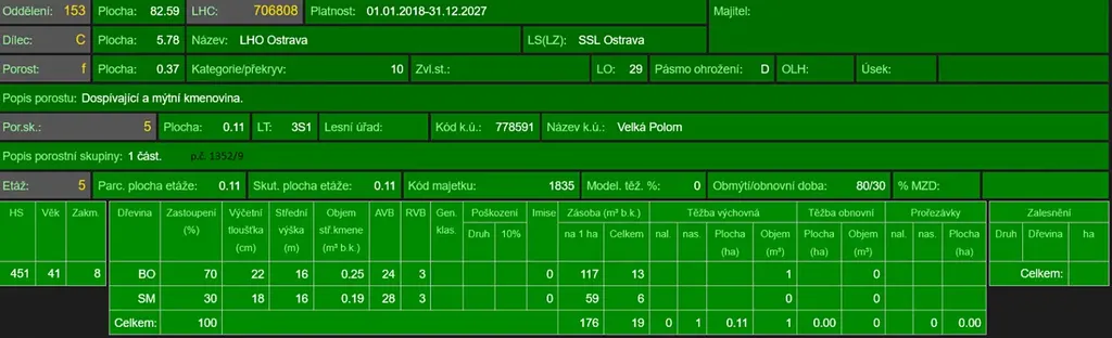 - p.č. 1352/9 vedená jako lesní pozemek o celkové výměře 3 708 m2 (stáří lesa 138 let a 48 let - zastoupení dřevin borovice, smrk)