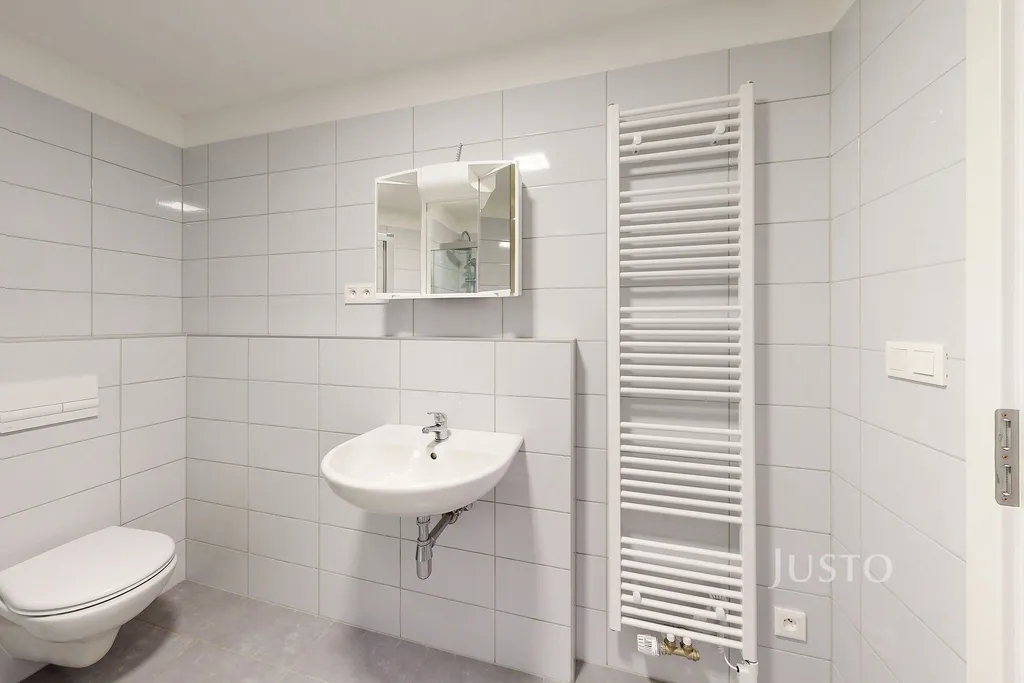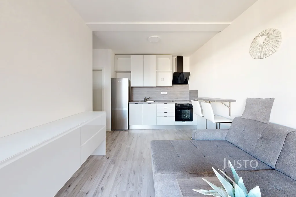 Interiér majitelé vybavili nábytkem na míru (vše, co vidíte na fotkách). Jedná se sice o byt s dispozicí 1+kk, ale v obýváku je vkusně vyřešený „spací kout“, který od prostoru kuchyně oddělen stěnou. Kuchyňská linka je kompletně zařízena – k dispozici je lednice, indukční varná deska, myčka, trouba, mrazák i barový jídelní stůl se dvěma židlemi. V koupelně najdete prostorný sprchový kout, toaletu a místo pro pračku.