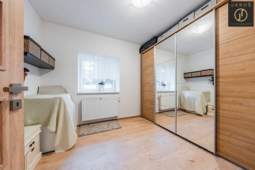 Dispozice bytu je řešena vstupní chodbou odkud je vstup do obývacího pokoje s plně vybavenou kuchyňskou linkou včetně spotřebičů s výstupem na terasu a do zahrady. Dále do dvou oddělených pokojů a koupelny s vanou se sprchovou zástěnou.