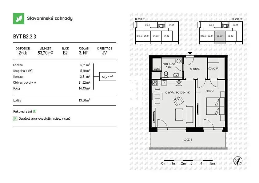 Byt B2.3.3 o dispozici 2+kk má podlahovou plochu 53,7 m², terasa o velikosti 13,86 m² a nachází se ve 3.NP bytového domu s nízkým počtem bytových jednotek.