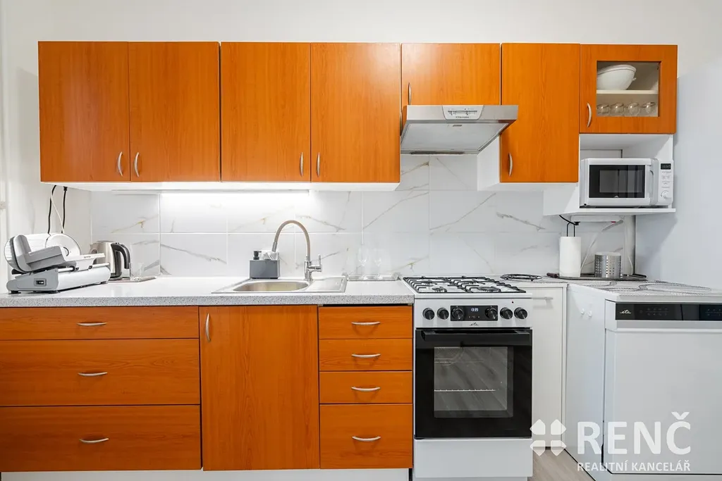 Byt je vybaven kuchyňskou linkou s novými spotřebiči: sporákem, digestoří, myčkou, mikrovlnnou troubou a lednicí s mrazákem. V předsíni bytu jsou instalovány vestavěné skříně, komora je vybavena policovým systémem, vstupní dveře jsou bezpečnostní. V koupelně je umístěn sprchový kout, umyvadlo se skříňkou, koupelnový nábytek a pračka. V obytných místnostech a v předsíni jsou nové laminátové podlahy, v koupelně a na WC je dlažba. K dispozici jsou dvě televize. V bytě jsou instalována nová tříkomorová okna, je vybaven osvětlením ve všech místnostech, je nově vymalován a byly provedeny nátěry dveří a radiátorů.