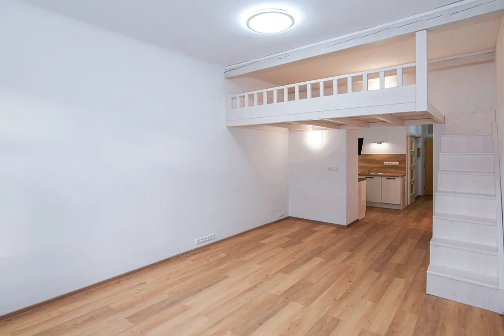 Hlavním prostorem bytu je místnost o velikosti 21 m², kde je na míru vyrobené patro na spaní s rozměry 2,8 x 1,2 m. Pod schody je praktický úložný prostor.