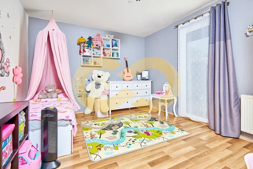 V přízemí najdete ložnici a dětský pokoj, oba s přímým vstupem na zahradu. Ranní káva na trávě? Děti běžící rovnou ven? Tady je to realita. K tomu nechybí ani koupelna a praktická spíž u kuchyně.