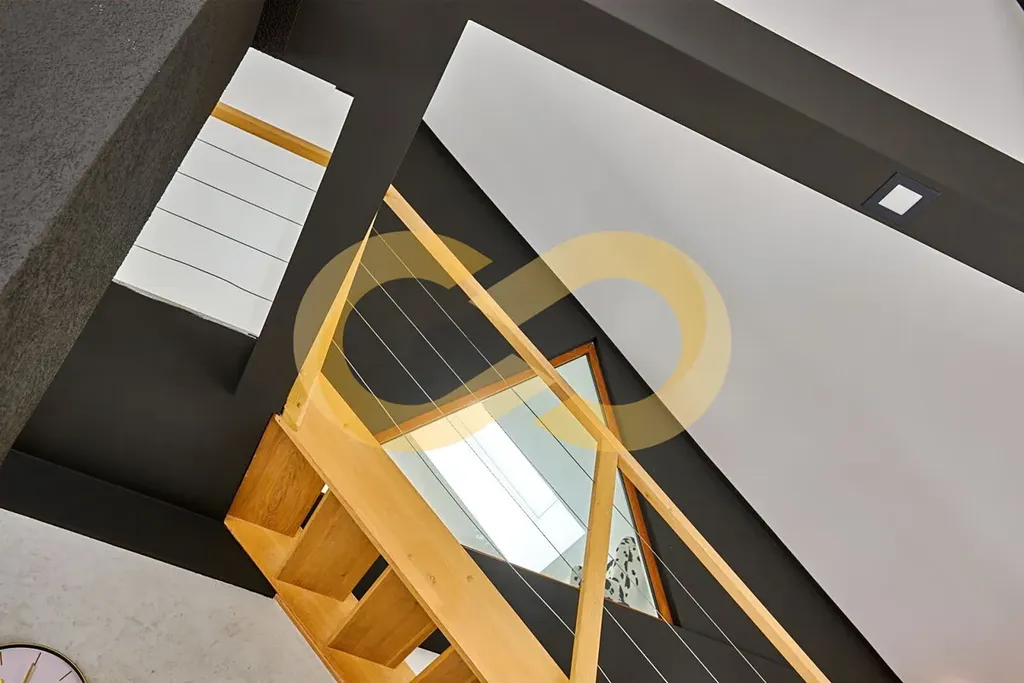 Dominantou domu je světlý obývací pokoj otevřený do krovu, díky čemuž působí prostorně, svěže a velmi moderně. Schodiště zde vede do otevřené pracovny, která se dívá přímo do obývacího prostoru. Je to ideální místo pro home office, klidné studium nebo knihovnu, kde se budete cítit nerušeně, ale stále propojeni s centrem dění v domě.