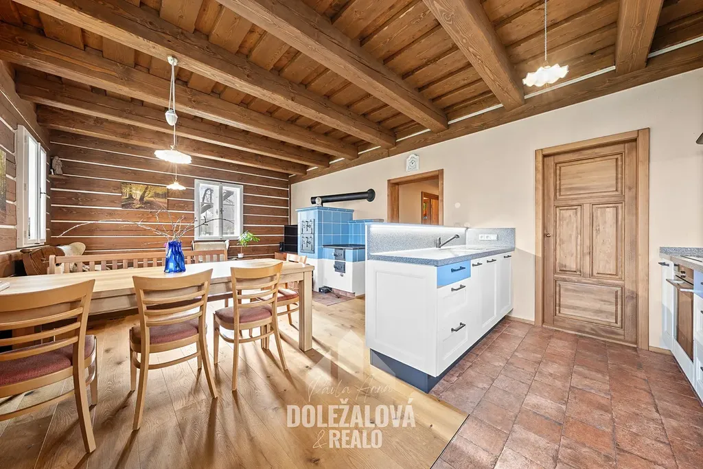 • Kvalitní vybavení – kuchyně Sykora, spotřebiče Siemens/Miele, kachlová kamna, podlahové topení IVAR, plynový kotel Geminox.