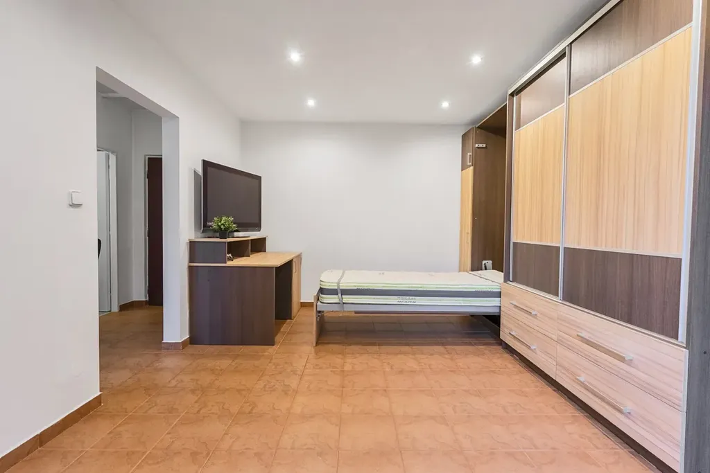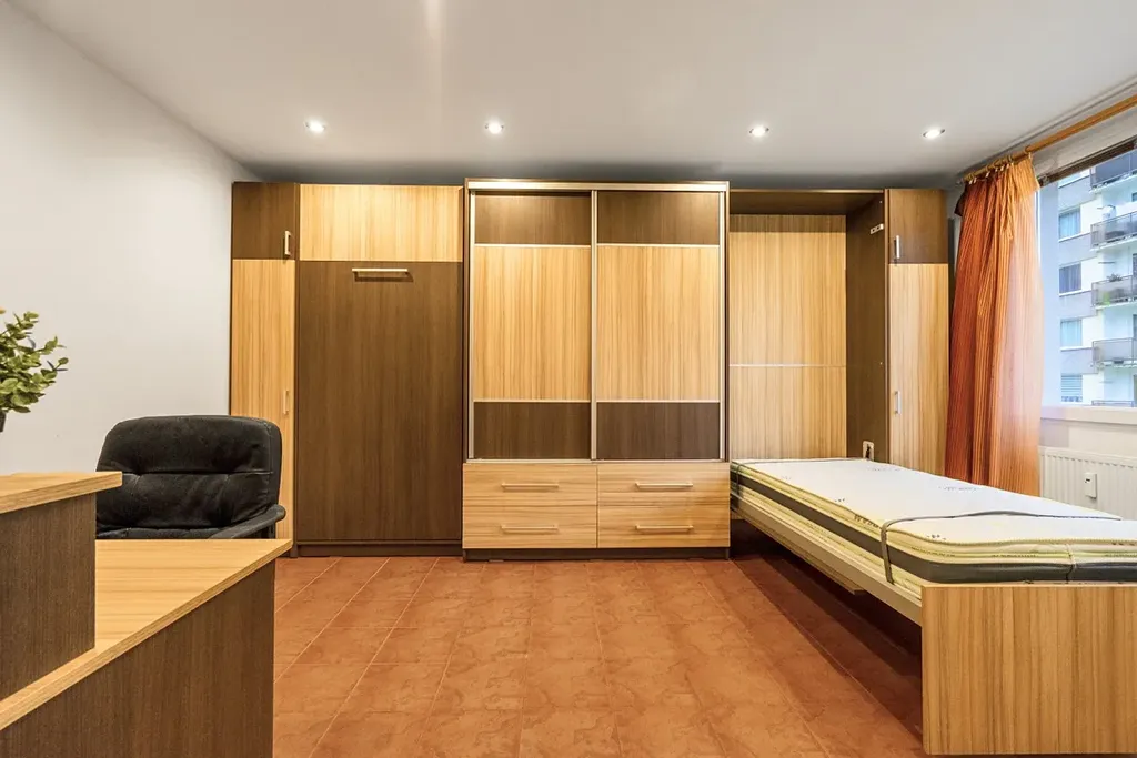 Bytová jednotka prošla kompletní rekonstrukcí - plastová okna, nové koupelnové jádro z Ytongu, nové rozvody IS (elektřina, odpady, voda), v celém bytě byla zvolena jako podlahová krytina dlažba, v pokoji jsou na míru zhotovené skříně se zabudovanými dvěma sklopnými lůžky a ve stejném dekoru pracovní stůl.