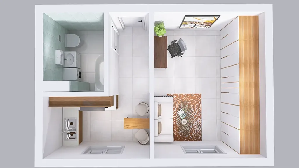 Dispozice: vstupní chodba s přímým vstupem do kuchyně (viz vizualizace), koupelna, ložnice. Příslušenství tvoří sklepní koje a možnost užívání kočárkárny.