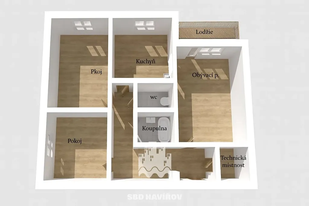 K bytu dále náleží prosklená lodžie vhodná k relaxaci, sklepní kóje a samostatná technická místnost, která poskytuje další praktický úložný prostor.