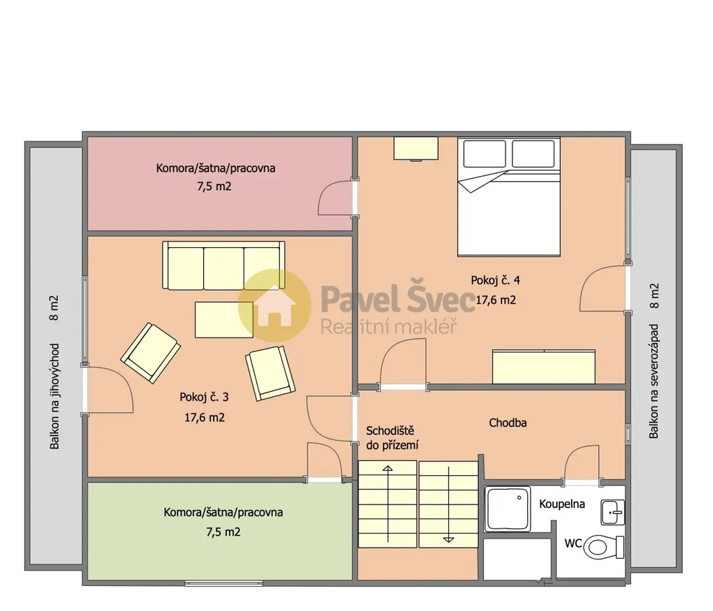 V obytné části je v přízemí kuchyně a dva pokoje, v podkroví další dva pokoje a dva velké balkony orientované na jihovýchod a severozápad - nabízejí krásné výhledy na okolní přírodu.