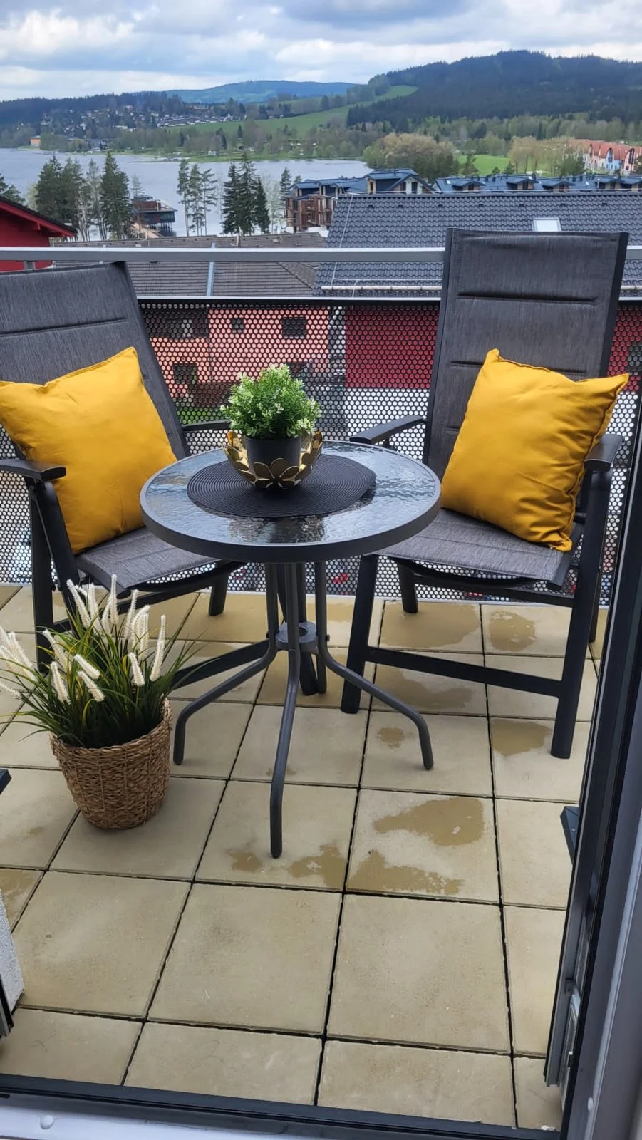 V horním patře apartmánu se nacházejí dva pokoje, z nichž jeden má vstup na druhý balkon s jedinečným výhledem na vodní nádrž Lipno. Součástí obou balkónů je i venkovní nábytek. Obě ložnice jsou plně klimatizované.