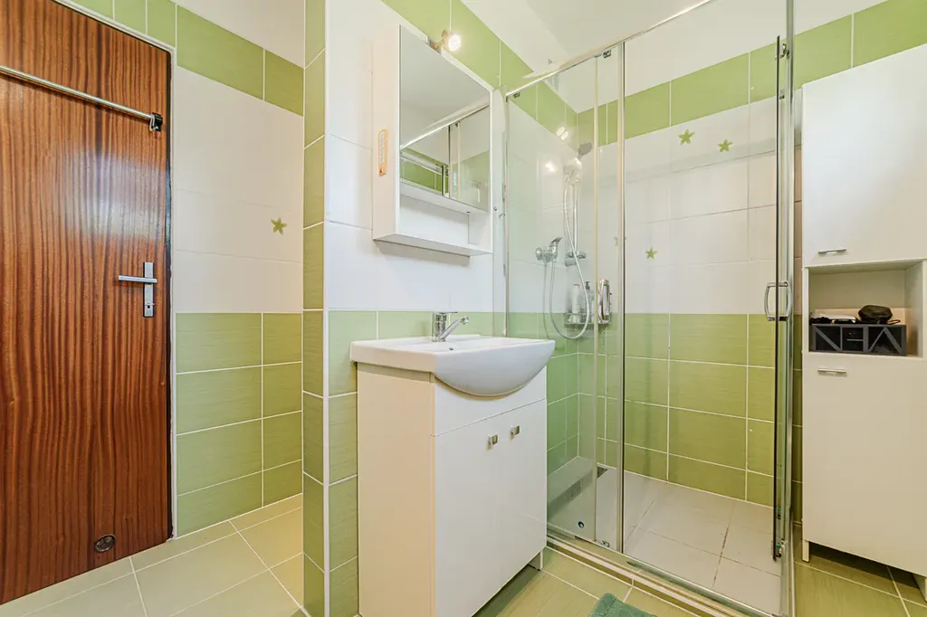 V prvním patře se nachází chodba a tři samostatné ložnice se skříněmi, lodžie, koupelna se sprchovým koutem a toaleta.