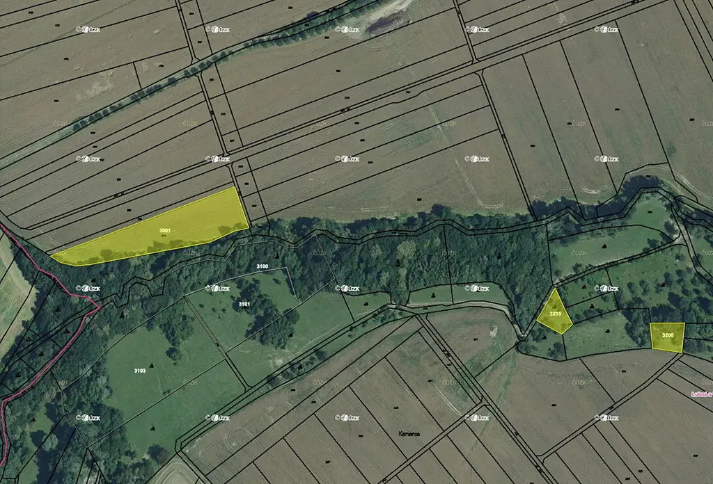 Pozemky patří pod LV: 252, parcelní číslo: 3001, 3206, 3215 o podílu 1/1.