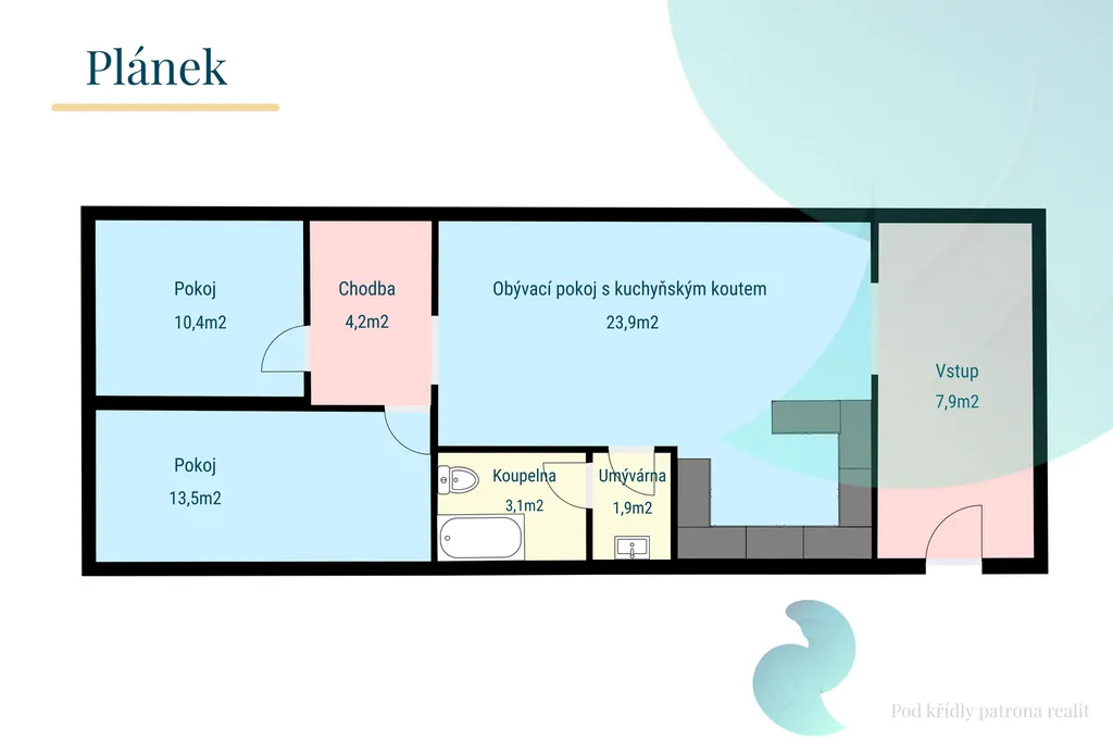 Byt je promyšleně dispozičně řešený tak, aby poskytoval maximální soukromí a komfort. Oddělení obytné a klidové části zajišťuje předsíň a především hala mezi obytnou a ložnicovou částí. Po vstupu do bytu vás přivítá prostorná předsíň (7,9 m²), ze které se vstupuje do vzdušného obývacího pokoje s kuchyňským koutem (23,9 m²). Na obytnou, rušnější část bytu navazuje hala, ze které je vstup do dvou neprůchozích pokojů (10,4 m² a 13,5 m²), ideálních jako ložnice, dětský pokoj či pracovna. Koupelna s vanou a WC je prakticky řešena přes malou předmístnost s umyvadlem.