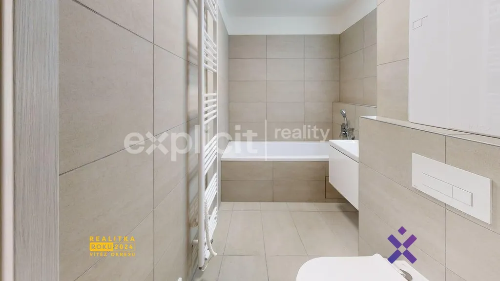 Kuchyňský kout je účelně navržen a plně osazen moderními spotřebiči, mezi které patří indukční varná deska, trouba, mikrovlnná trouba, myčka nádobí a lednice s mrazákem. Součástí vybavení bytu je rovněž pračka. Koupelna je řešena v moderním stylu, vybavena vanou, keramickými obklady a sanitou kvalitních značek.