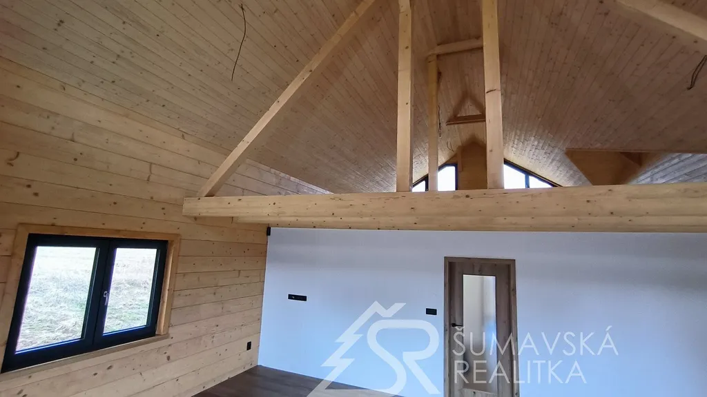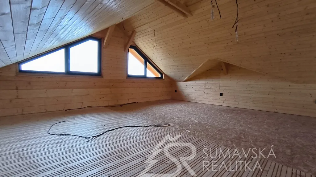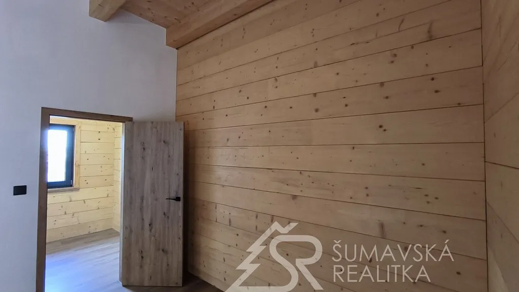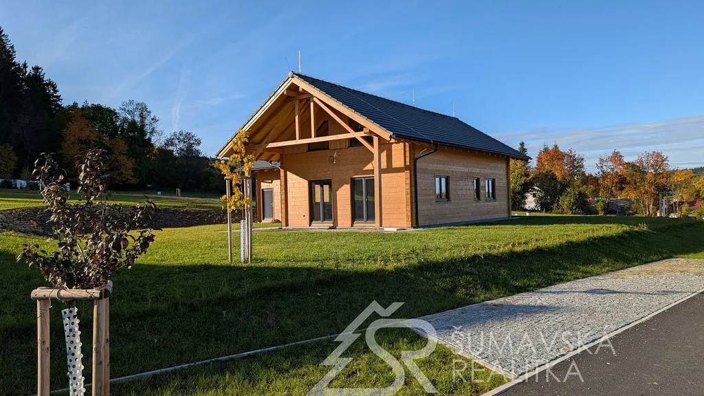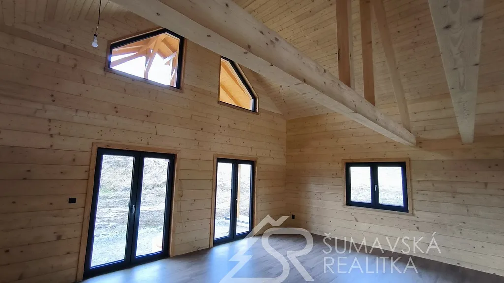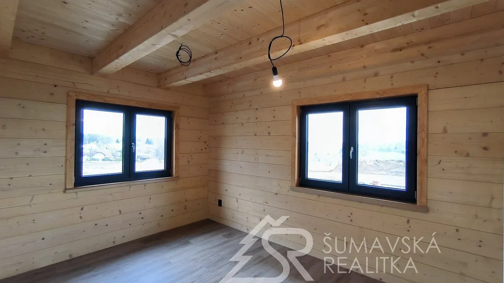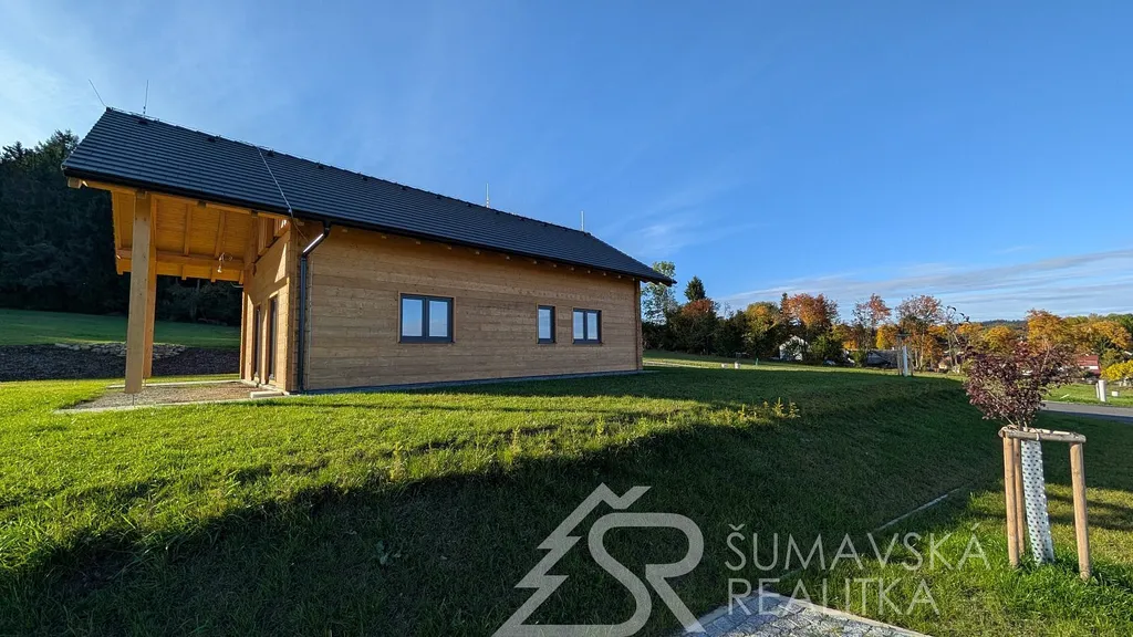 Popis nemovitosti: právě realizovaný rodinný dům je stavěný jako dřevostavba s roubenou obvodovou stěnou z lepených hranolů t.24 cm (bez sedání). Přírodní masivní dřevo je použito i uvnitř domů a vytváří tu správnou atmosféru. Dům je koncipován do tvaru „L“ s vlastní garáží na straně jedné a s velkorysým otevřeným obývacím pokojem s terasou na straně druhé. Uvnitř se nachází dvě ložnice (se šatnou), koupelna, samostatné WC, technická místnost a chodba. Pro užívání je připraveno i podkroví. Střešní krytina je Bramac Tegalit Protector, okna PVC Vekra, sanita od značek Villeroy Boch, Hans Grohe a Riho. Stavba je dokončena s použitím kvalitních standardů (podlahová krytina vinil, vypínače ABB Zoni v černé barvě a bezfalcové dveře). Stejně tak koupelny jsou voleny v materiálech a odstínech k přírodnímu dřevu. Vytápění zajišťuje tepelné čerpadlo Panasonic. Pro případného zájemce se mohou standardy upravit na přání.