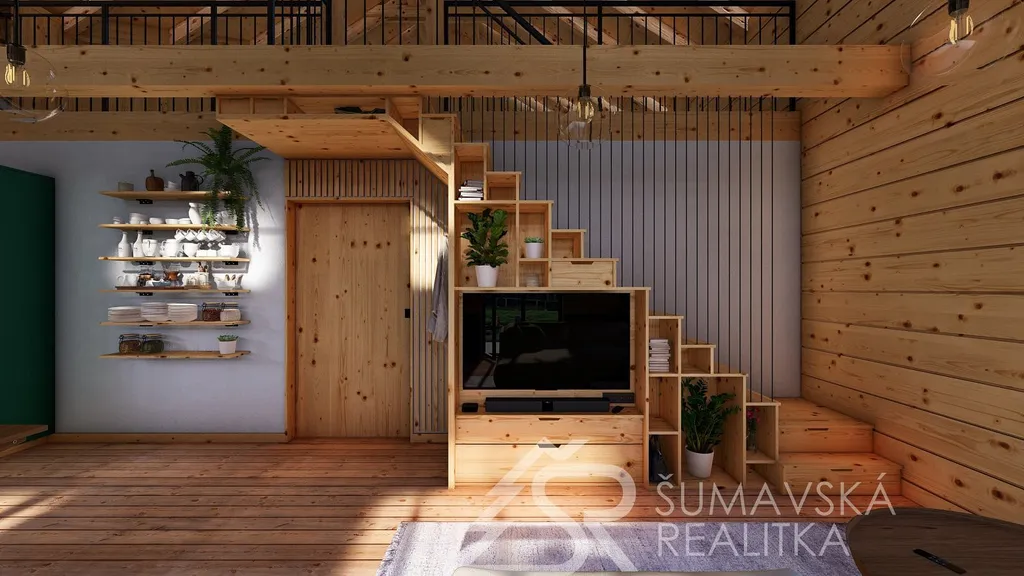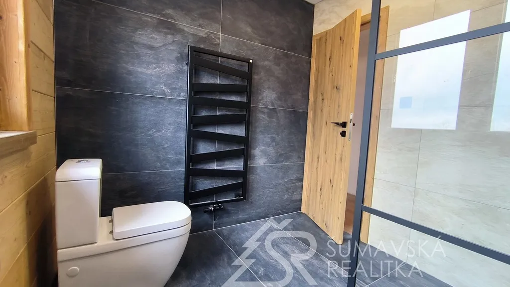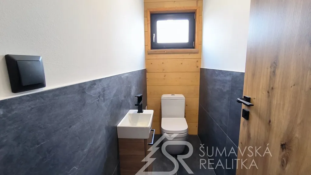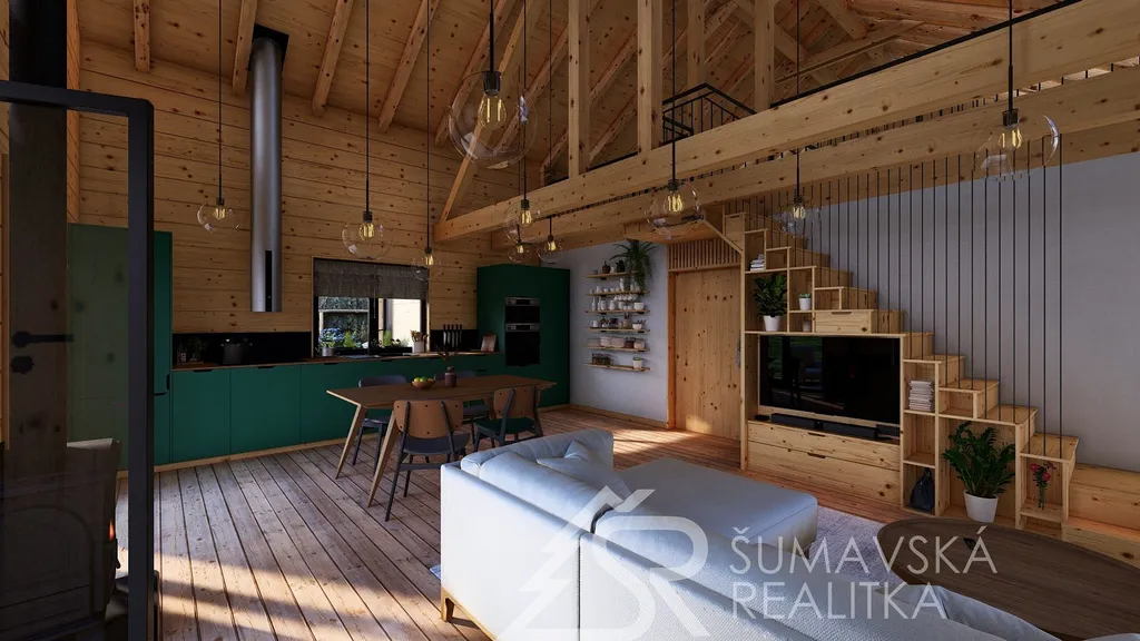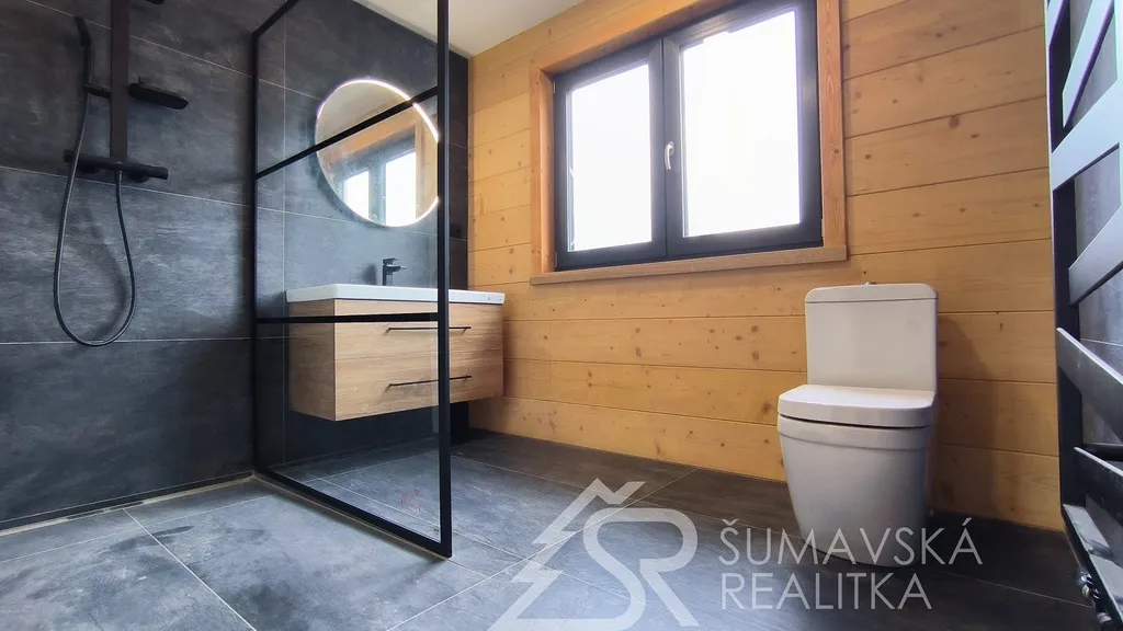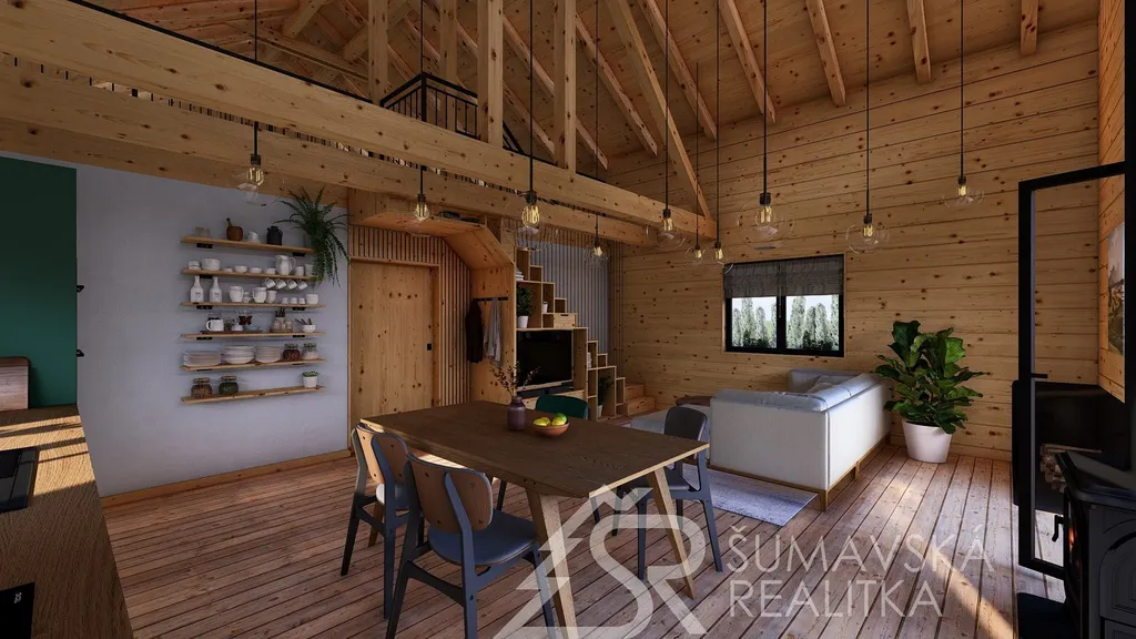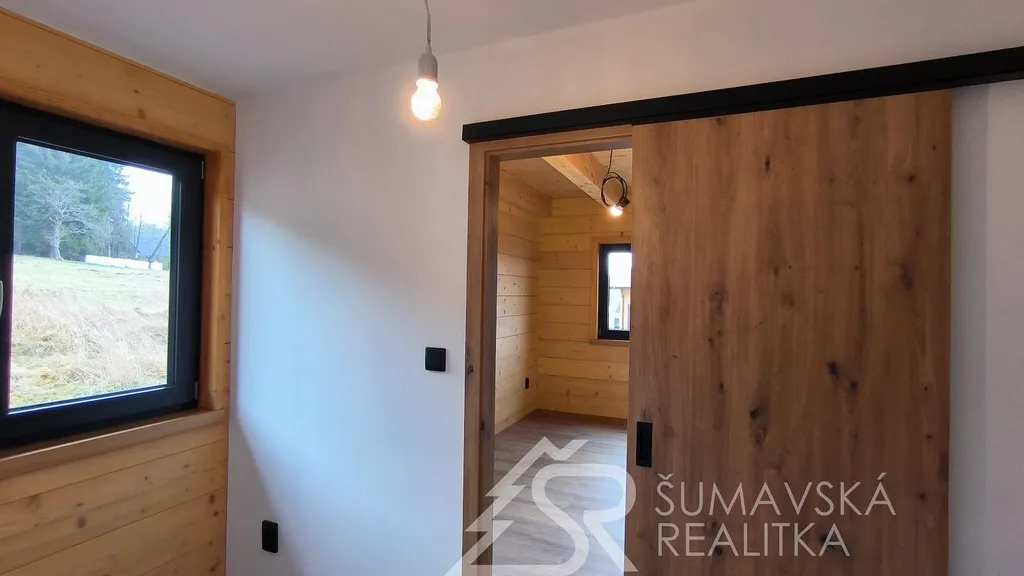 Popis nemovitosti: právě realizovaný rodinný dům je stavěný jako dřevostavba s roubenou obvodovou stěnou z lepených hranolů t.24 cm (bez sedání). Přírodní masivní dřevo je použito i uvnitř domů a vytváří tu správnou atmosféru. Dům je koncipován do tvaru „L“ s vlastní garáží na straně jedné a s velkorysým otevřeným obývacím pokojem s terasou na straně druhé. Uvnitř se nachází dvě ložnice (se šatnou), koupelna, samostatné WC, technická místnost a chodba. Pro užívání je připraveno i podkroví. Střešní krytina je Bramac Tegalit Protector, okna PVC Vekra, sanita od značek Villeroy Boch, Hans Grohe a Riho. Stavba je dokončena s použitím kvalitních standardů (podlahová krytina vinil, vypínače ABB Zoni v černé barvě a bezfalcové dveře). Stejně tak koupelny jsou voleny v materiálech a odstínech k přírodnímu dřevu. Vytápění zajišťuje tepelné čerpadlo Panasonic. Pro případného zájemce se mohou standardy upravit na přání.