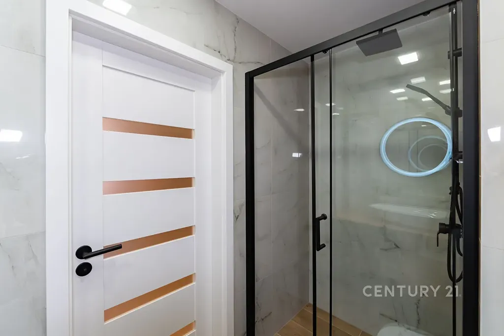 • Stylová koupelna se sprchovým koutem, velkoformátovými obklady, novým sanitárním vybavením, skříňkou pod umyvadlo, zrcadlo s podsvícením a WC