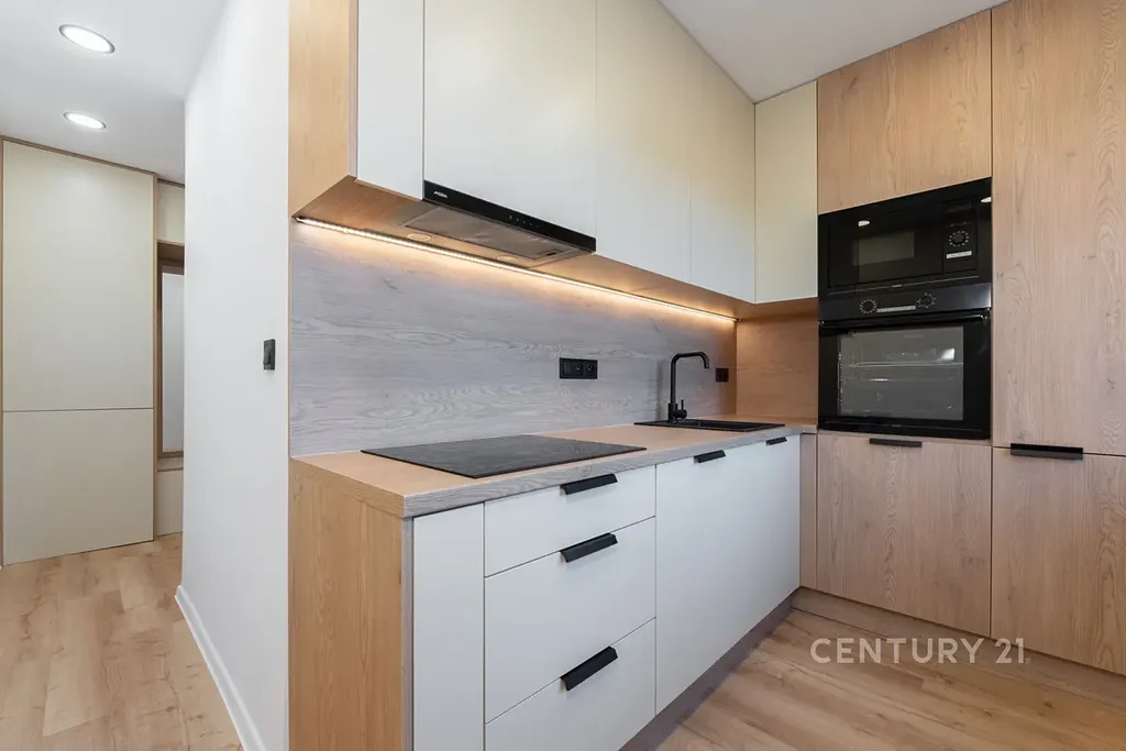 • Moderní kuchyňská linka (LED podsvícení) s vestavnými spotřebiči (lednice, myčka, elektrická trouba, sklokeramická deska, mikrovlnná trouba a digestoř)