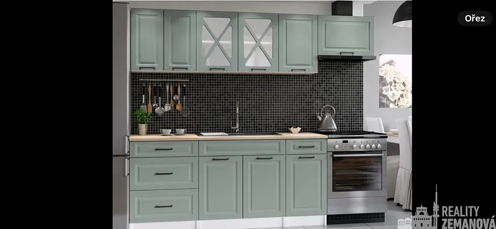 obývací pokoj s kuchyňským koutem 19,79m2 (bude dodána zelená linka, černé spotřebiče: myčka, lednice s mrazákem, trouba, mikrovlnka, digestoř)