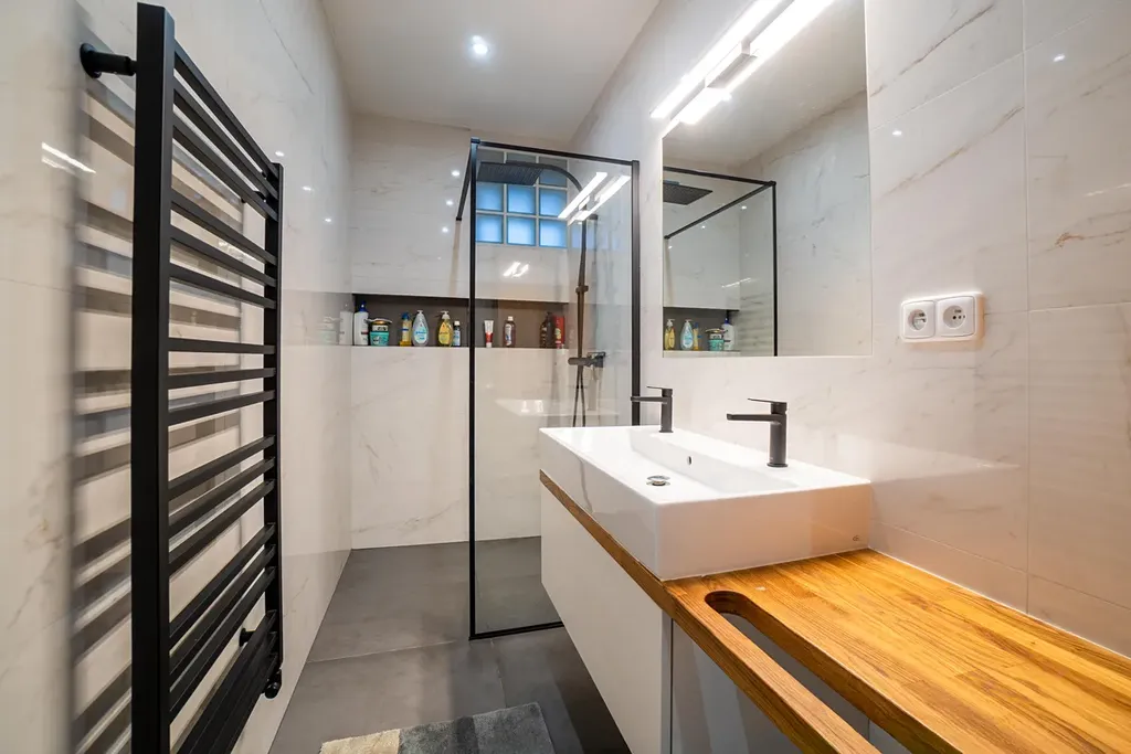 Byt prošel nedávno velmi náročnou a kvalitní rekonstrukcí. Vše bylo rekonstruováno včetně rozvodů, podlah, omítek, dveří, obkladů, sanity a podobně v exkluzivní kvalitě. Podlahy jsou dřevěné, veškeré omítky jsou nové, koupelna a WC jsou obloženy velkoformátovými obklady a vybaveny kvalitní sanitou. Veškerý vestavný nábytek je na míru s použitím vysoce kvalitních materiálů. Všechny dveře jsou posuvné opět na míru. Nová kuchyň s masivní dřevěnou deskou a kvalitními spotřebiči je součástí prodeje. Stejně tak i šatna s vestavným nábytkem, která je přímo u ložnice. Parapety u oken jsou z masivního dřeva. Vedle kuchyně je technická místnost pro pračku a sušičku