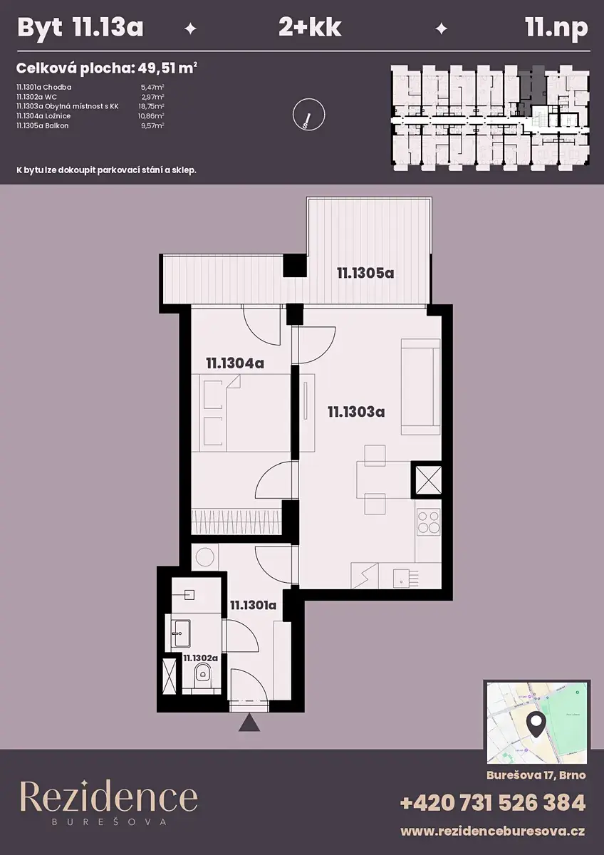Nabízíme k prodeji moderní byt 2+kk o podlahové ploše 39,94 m2 s balkonem 9,57 m2 nacházející se v námi připravovaném projektu Rezidence Burešova v atraktivní lokalitě Veveří. Byt se nachází v 11.NP, orientace bytu do vnitrobloku, jižní strana s výhledem na Petrov a Špilberk. K bytu lze koupit parkovací místo v zakladači i sklad.