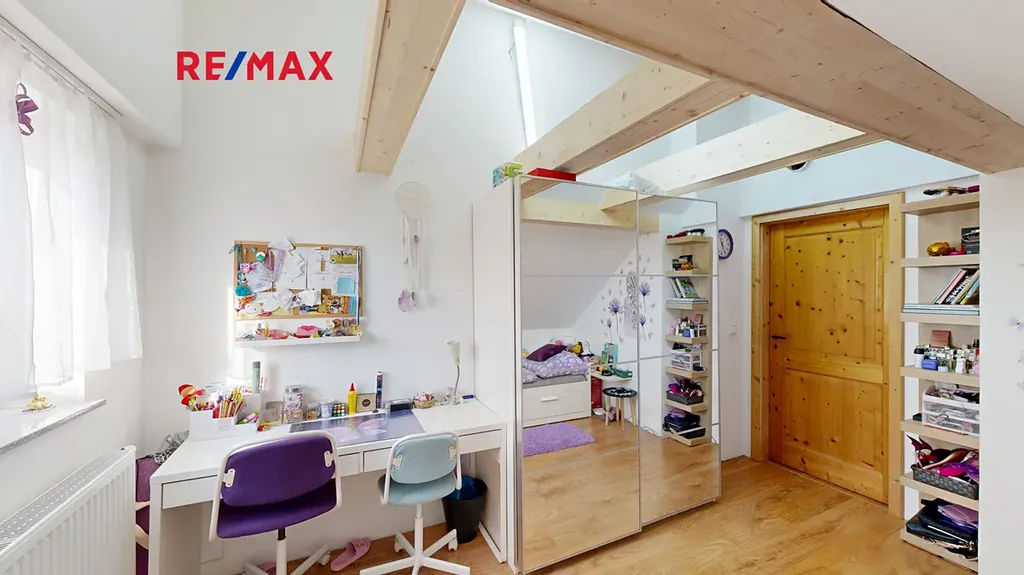 V patře najdete druhou koupelnu a tři samostatné pokoje, záleží na Vás, zda je využijete jako ložnice, pokoje pro hosty nebo například pracovny. Velká okna zajišťují dostatečné prosvětlení a praktické uspořádání místností nabízí spoustu úložného prostoru i ve dvou šatnách. Snadno oddělit soukromé zóny od společenských umožňuje rozdělení domu do tří podlaží.