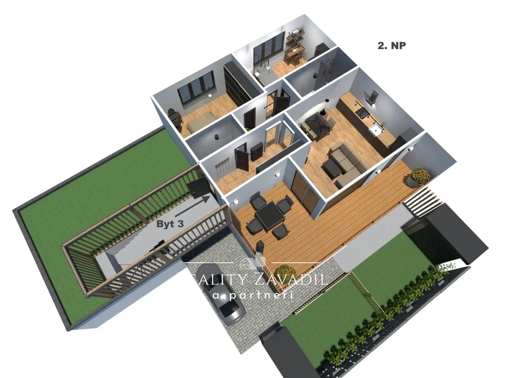 2.NP 3+KK 74m2 terasa 26m2, jedno kryté parkovací stání, sklep 5,7m2, zahrada a zahradní kóje