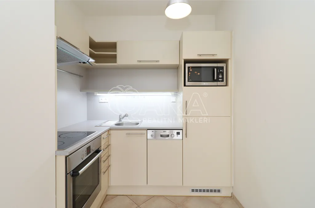 Kuchyně je vybavena pracovní linkou, myčkou, lednicí, mikrovlnou troubou, digestoří, el. varná deskou a el. troubou.