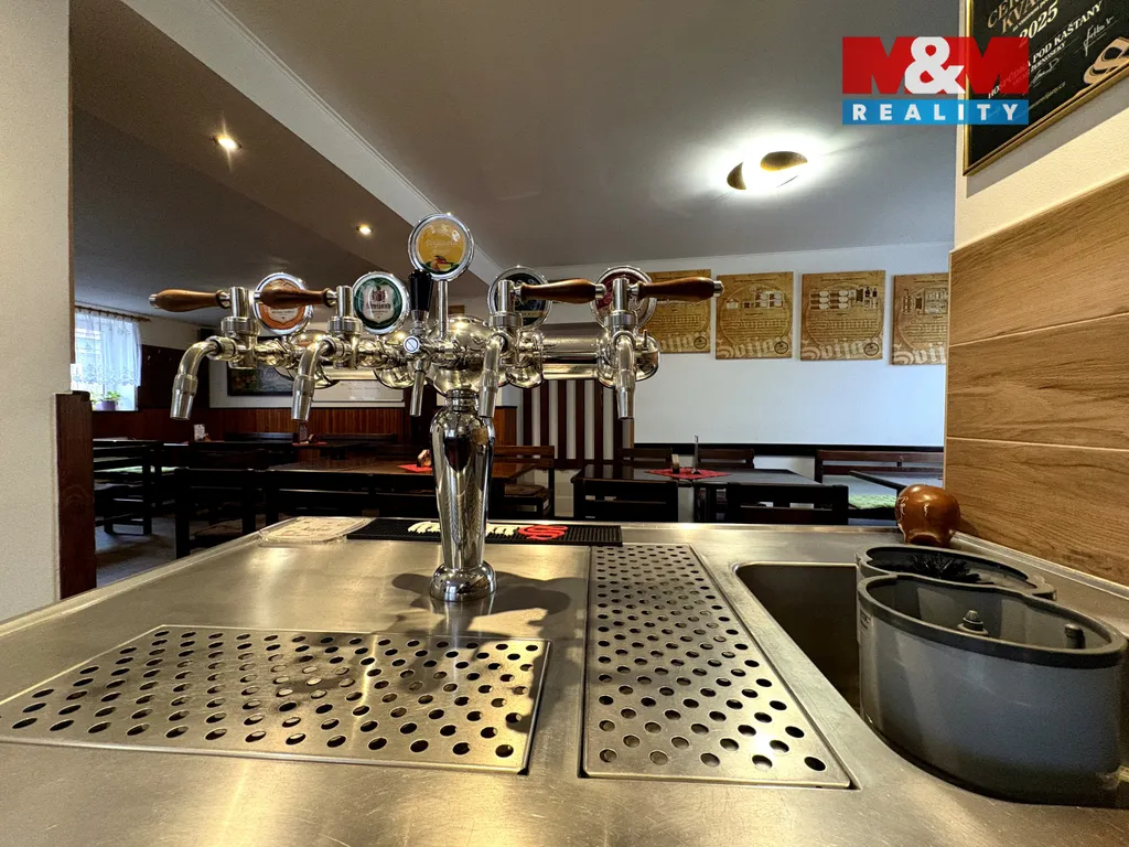 Třípodlažní cihlová budova s podzemním podlažím se nachází v rušné části obce, což zajišťuje stálý přísun stálých i nových zákazníků.