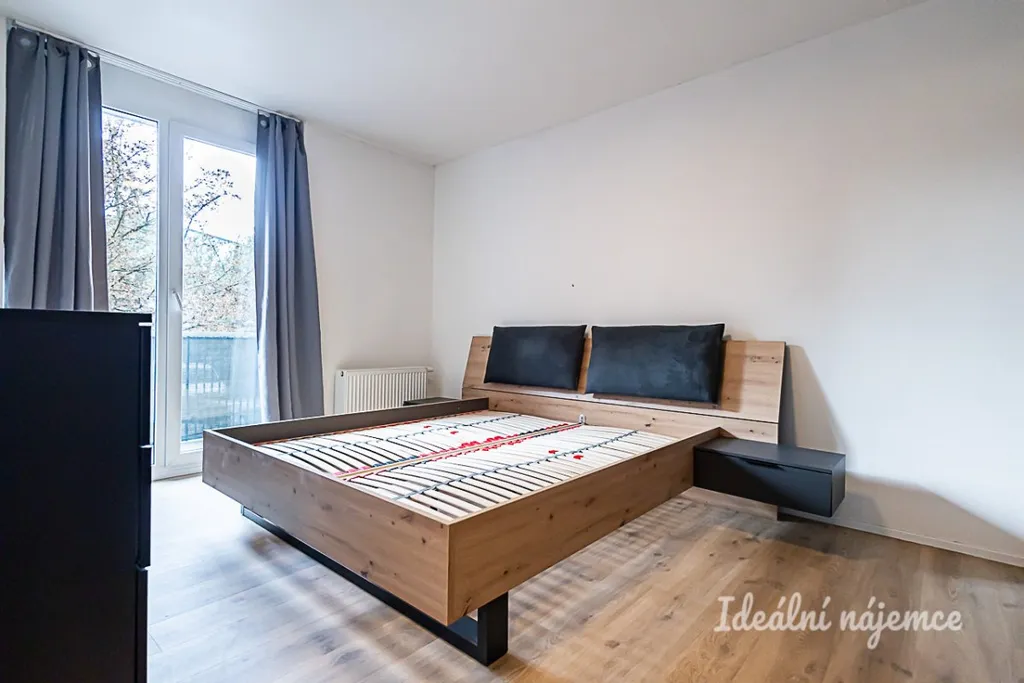 Samostatný pokoj je vybaven manželskou postelí, úložným prostorem a také přímým vstupem na balkon. Koupelna disponuje vanou, umyvadlem a pračkou, toaleta je umístěna samostatně. Součástí bytu je rovněž praktická úložná místnost.