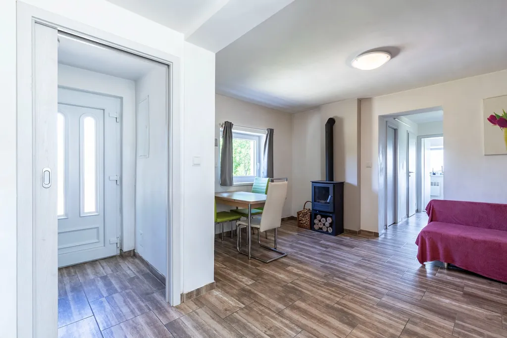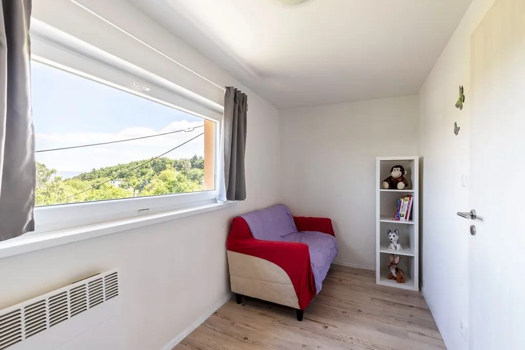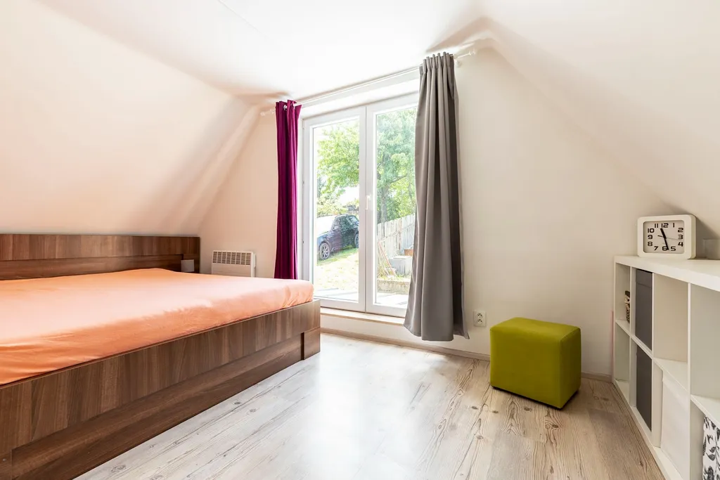 Dovolte mi Vám představit výjimečné místo plné klidu, s výhledy do přírody a vynikajícím dosahem občanské vybavenosti. Rodinný dům 4+KK po celkové rekonstrukci se nachází v rekreačně obydlené části Brna – Žebětín. Disponuje vlastní vrtanou studnou s pitnou vodou, parkováním na vlastním pozemku pro 3 auta a dostatečně prostorným pozemkem. Dispozice rodinného domu na vlastním pozemku s příjezdovou komunikací sestává ze tří pater – podzemní podlaží (35,4 m2), přízemí (35,1 m2), podkroví (20 m2), to celé o celkové užitné ploše 90 m2. V podzemním podlaží se nachází nyní úložné prostory s potenciálem vybudování 1+KK s koupelnou a WC. Přízemí: zádveří, kuchyně na míru se spotřebiči, obývací prostor s krbovými kamny doplňuje jídelní kout (12,3 m2). Dále koupelna s vanou (2,7 m2) a samostatné WC (1,73 m2), dětský pokoj (10,75 m2) s krásným výhledem do okolí Bystrce, technická místnost pod schodištěm. Podkroví: ložnice (13,2 m2) s orientací JZ a velkými okny vybízející ke vstupu na terasu (12,5 m2), kterou je možné zde vybudovat, dále dětský pokoj či pracovna (6,7 m2). Nespornou výhodou jsou velmi nízké náklady díky nízkému tarifu, vlastní vrtané studni hluboké 140 m s pitnou vodou v kombinaci s vytápěním elektrickými přímotopy. Odpady jsou řešeny řádně zkolaudovanou ČOV. Potenciál je ve vybudování solárních panelů s kotlem k dosažení ještě nižších nákladů, dále zřízení trvalého bydliště v objektu také není problém. V okolí žijí také rodiny s dětmi, které využívají objekty k trvalému bydlení nebo rekreaci a pokud zároveň preferujete klid, jste na vyvýšeném místě, které tento požadavek splňuje. Členěná zahrada je rozdělena na prostor pro parkování s příjezdem po obecní komunikaci, místo pro děti s klidovou částí se zapuštěným bazénem posezením u ohně s množstvím ovocných stromů a část kaskádovitou pro vybudování okrasných záhonů. Občanská vybavenost okolí: MHD 5 min., vše v blízkém centru Žebětína, cyklostezky vedoucí do okolí obory Holedná, blízkost chráněného území Žebětínského rybníka, Brněnské přehrady, Vrboveckého Mlýna, Žebětínského dvoru, restaurací, sportovišť, ZUŠ, MŠ, ZŠ a mnoho dalšího.
