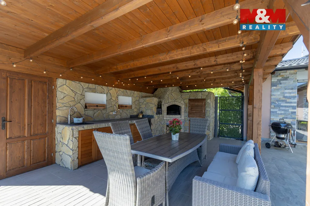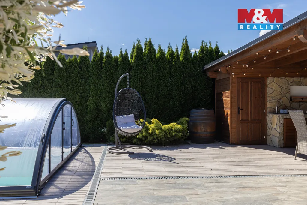 Moderní bungalov 5+KK v blízkosti přírody a jen kousek od Ostravy v obci Jistebník. Nabízíme k prodeji samostatně stojící cihlový bungalov o užitné ploše 172 m² na pozemku 1050 m² v klidné, lukrativní lokalitě obce Jistebník. Tento dům je ideální volbou pro náročné rodinné bydlení. Dispozice: prostorný obývací pokoj s novou kuchyní, 4 komfortní pokoje, koupelna s vanou, sprchovým koutem a WC, samostatné WC, technická místnost, vstup na venkovní terasu. Exteriér: nová fasáda kombinovaná se žulovými prvky, luxusní venkovní kuchyně z pískovce se sporákem, grilem, udírnou a pecí na pizzu, venkovní stání pro dvě auta, zastřešený bazén s mořskou vodou, elektrické venkovní žaluzie na domě. Technické vybavení: tepelné čerpadlo, krb, klimatizace, bazén 8×4 m. Energetická třída: B – velmi úsporná. Tento dům poskytuje pohodlné a moderní bydlení v prestižní lokalitě, ideální pro rodiny. Pro více informací nebo domluvení prohlídky nás prosím kontaktujte.