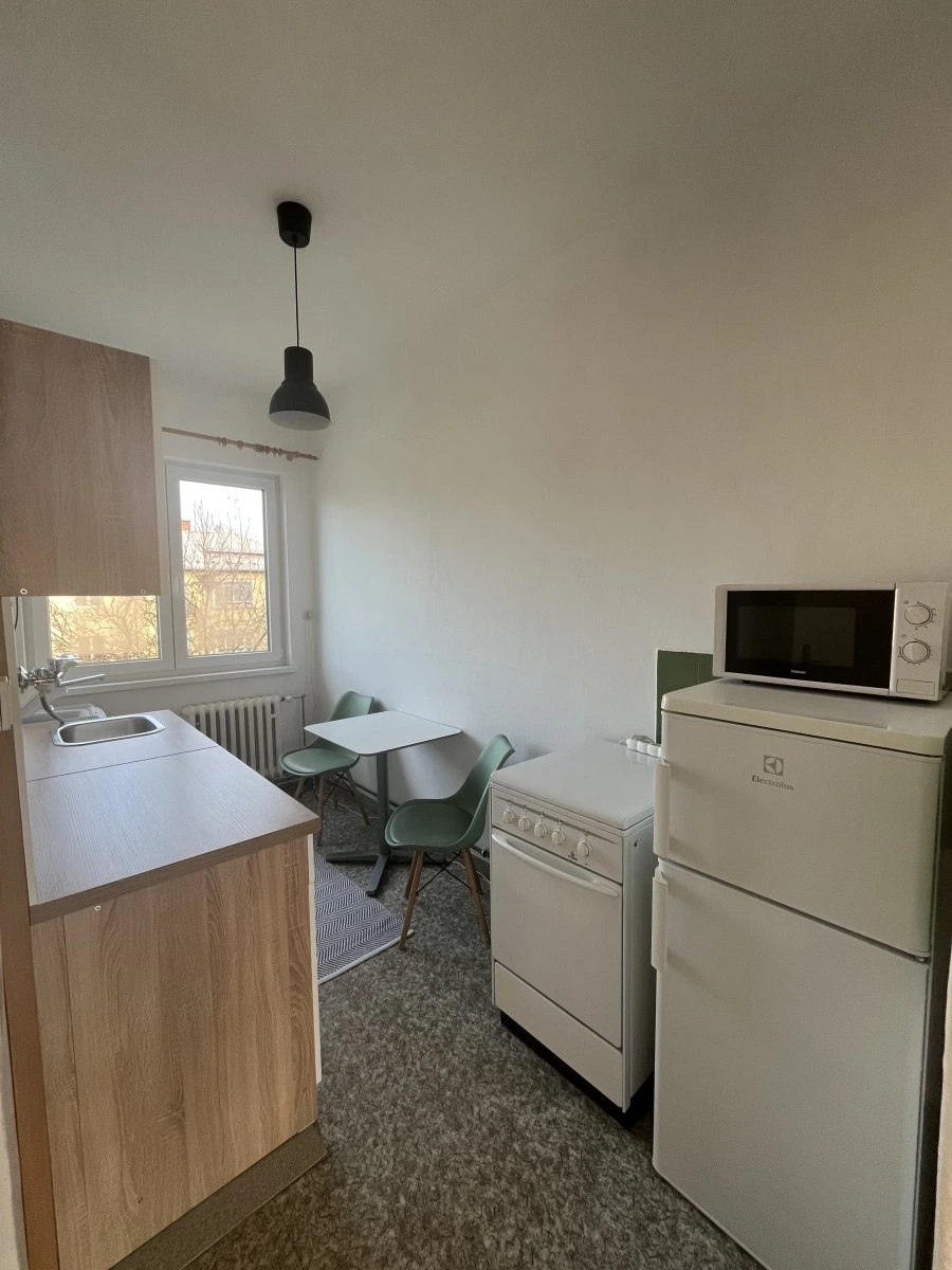 Dominantou bytu je prostorný a prosvětlený obývací pokoj s výhledem do zahrady, kde je možné mít posezení a tím místo pro odpočinek. Kuchyň vybavená lednicí, plynovým sporákem a pračkou dále se tu nachází ještě stů s židlemi.