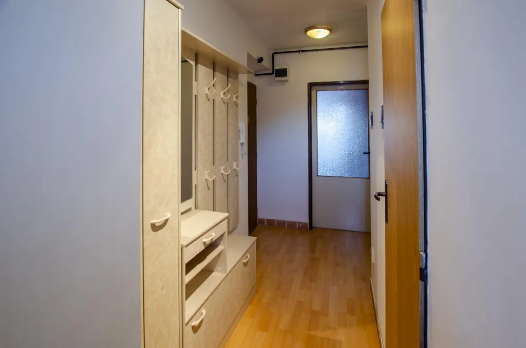 Vybavení bytu: manželská postel, prostorná šatní skříň, sedací souprava v obývací části, obývací stěna, stůl + židle. Kuchyňská linka je vybavena troubou, plynovou varnou deskou, mikrovlnnou troubou a myčkou na nádobí. V koupelně je sprchový kout. Úložné prostory na chodbě. Toaleta je oddělena, s oknem do vnitrobloku.