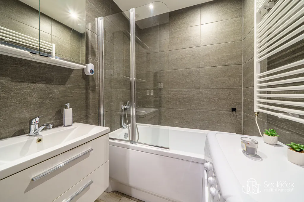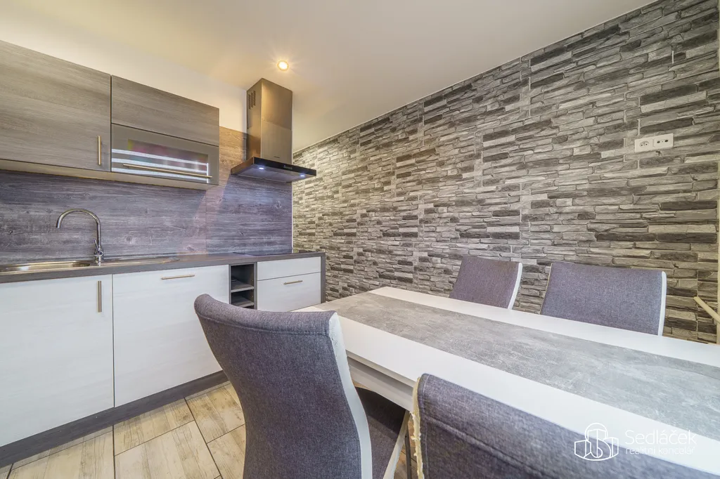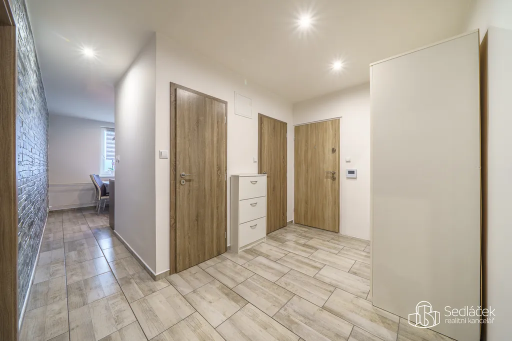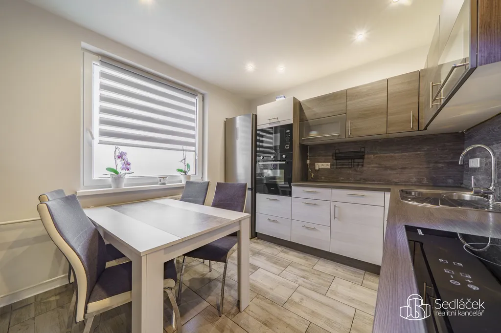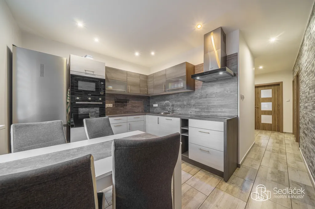 Rohová kuchyňská linka na míru je kompletně vybavená spotřebiči. Byt je zabezpečený vchodovými bezpečnostními dveřmi, má snížené stropy s LED bodovkami, na zemi je plovoucí podlaha a dlažba, samozřejmostí jsou plastová okna, zděné jádro se samostatnou koupelnou i WC, dveře s obložkami, nová elektroinstalace , na oknech rolety den a noc apod.