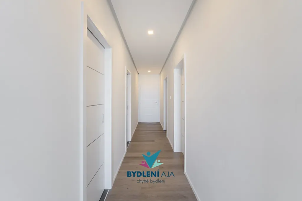 1x ložnice se šatnou a terasou, 2x dětský pokoj, pracovna, kuchyně s obývákem, spižírna, technická místnost, 2 x koupelna, 2x wc, 1x bidet a garáž pro dva velké rodinné vozy, velká terasa z obývacího pokoje.