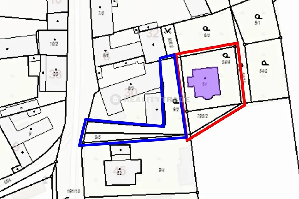 Součástí prodeje je pozemek st. č. 64 výměra 123 m2, zastavěná plocha a nádvoří, jejíž součástí je rozestavěná, nedokončená budova (rodinný dům) bez s čísla popisného, pozemek č. 54/4 výměra 369 m2, zahrada a pozemek č. 795/2 výměra 101 m2, orná půda. Vše je označeno červenou čarou. Dále k domu bude zajištěn přístup formou věcného břemene nebo odprodejem poloviny přístupové cesty. Tyto pozemky jsou vyznačeny modrou čarou.