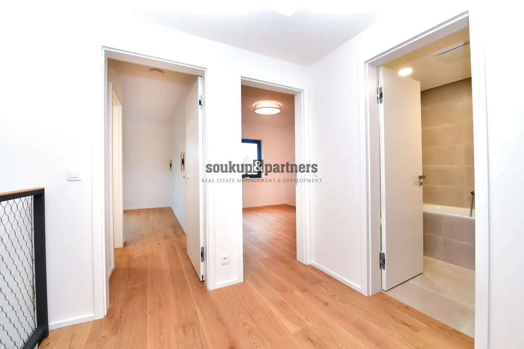 Novostavba ŘRD 7+kk + terasa + balkon + garáž a 2x parkovací stání - užitná plocha 220 m2, který se nachází na pozemku o celkové výměře 190 m2 v Praze 4 - Háje, přímo u Hostivařské přehrady s pláží a parkem. Jedná se o dosud neobývanou novostavbu kolaudovanou v roce 2025. V domě jsou 4 samostatné ložnice, 2 x koupelna se sprchovým koutem a vanou, 3x WC, obývací pokoj se vstupem na balkon, kuchyň s jídelnou, moderní kuchyňská linka s vestavěnými spotřebiči - lednice s mrazákem, myčka, horkovzdušná trouba, indukční varná deska, mikrovlnka, digestoř, prádelna, prostorná předsíň. Podlahové vytápění a teplou vodu zajišťuje vlastní tepelné čerpadlo. Okna jsou s izolačním 3 sklem (v 1.NP s bezpečnostním zasklením), na všech oknech předokenní žaluzie na dálkové ovládání, videotelefon v obou patrech, příprava na klimatizaci. V celém domě jsou použity pouze kvalitní a moderní materiály - na podlahách třívrstvé dřevěné dubové podlahy, dlažba, obklady, vypínače Schneider, veškeré zařizovací předměty jsou od firem Laufen, Grohe a Franke, datové zásuvky ve všech místnostech. K domu přísluší zahrada o výměře 91 m2 s podzemní nádrží na dešťovou vodu, dřevěná venkovní terasa je z materiálu Thermowood s venkovní zásuvkou a nezámrzným kohoutem na vodu. Samostatný vjezd pouze pro rezidenty 5 RD přes závoru na dálkové ovládání. Poloha RD přímo u Hostivařské přehrady s pláží, volejbalovým hřištěm a parkem s cyklostezkami a tenisovými kurty zajišťuje sportovní vyžití pro každého vyznavače sportu. V docházkové vzdálenosti je stanice metra Háje, stanice autobusů, mnoho obchodů a restaurací, několik základních škol a školek, banky a zdravotní střediska. V tomto RD jste blízko krásné přírody, ale máte i veškeré vymoženosti moderního bydlení. Při uzavření nájemní smlouvy do konce roku 2025 sleva z ceny 83.000,-Kč na částku 78.990,-Kč.