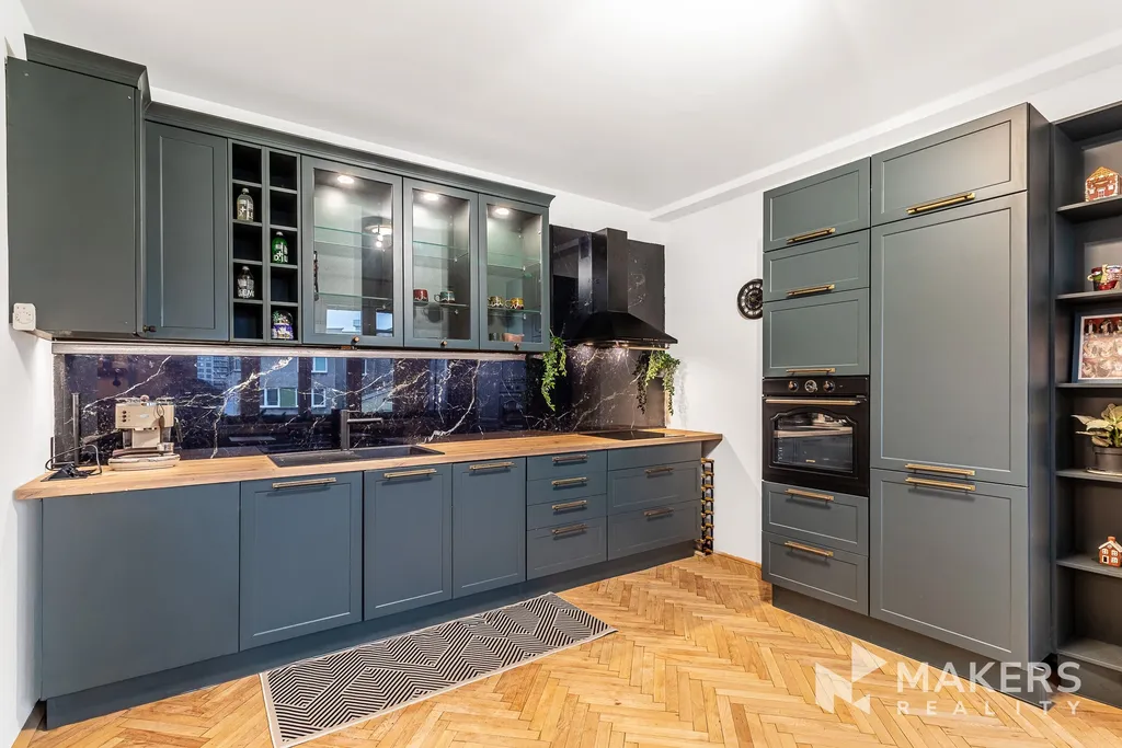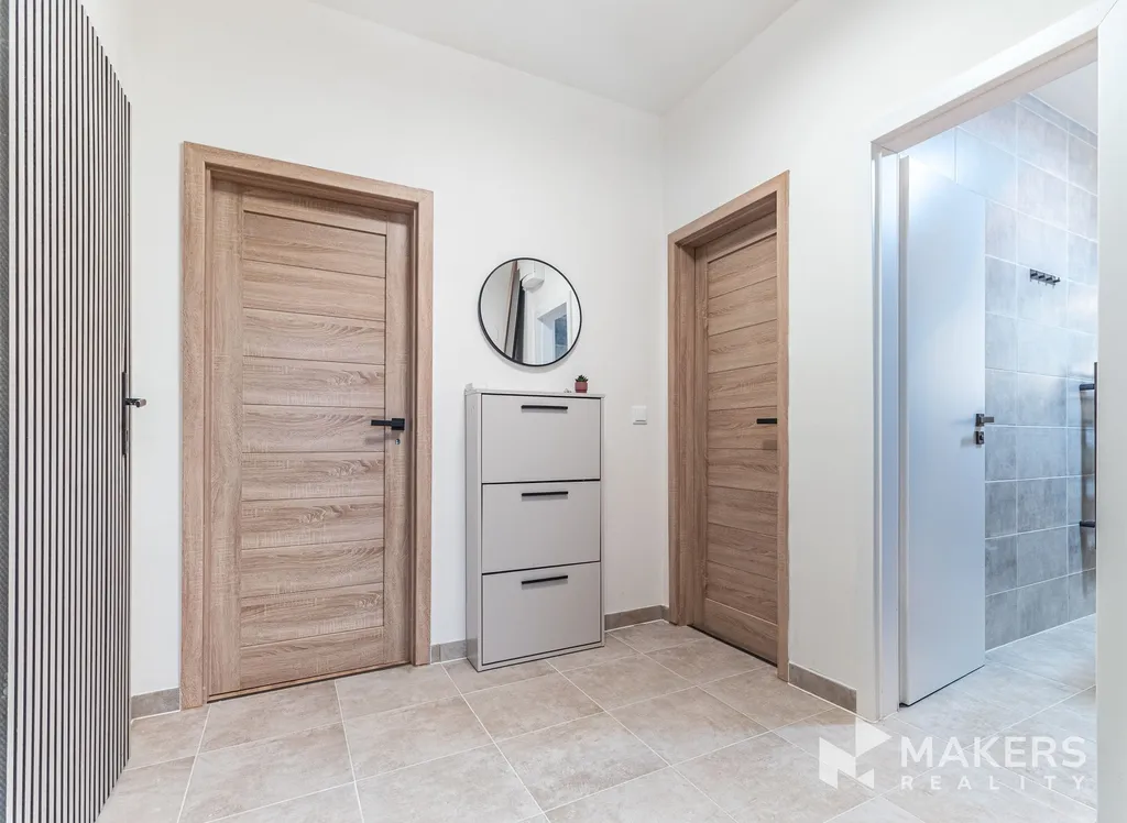 Srdcem bytu je otevřený obývací prostor s kuchyní, který působí vzdušně, klidně a přirozeně; kuchyňská linka značky Gorenje je plně vybavená a plynule navazuje na praktický barový pult, jenž nabízí místo jak pro ranní kávu, tak pro večerní posezení s přáteli či práci z domova. Celý obytný prostor sjednocuje elegantní dřevěná podlaha ve vzoru rybí kost, která interiéru dodává teplo, nadčasový charakter a pocit domova, a z obývací části je vstup na balkon, jenž příjemně rozšiřuje obytnou zónu a poskytuje prostor k odpočinku.