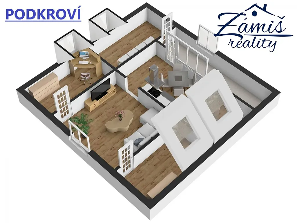 V podkroví jsou vybudovány 2 větší obytné místnosti s rovným stropem a 4 menší, s využitím třeba jako pracovna, šatna a úložné prostory. Všechny místnosti mají okno.