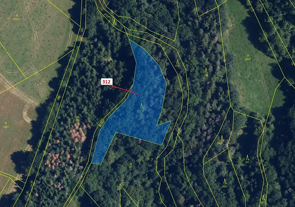 Lesní pozemek o výměře 2554 m2, parcelní číslo 312, podíl 1/1, katastrální území Bezděkov nad Třebůvkou, obec Bouzov, obec s rozšířenou působností Litovel, okres Olomouc, Olomoucký kraj. Po těžbě.