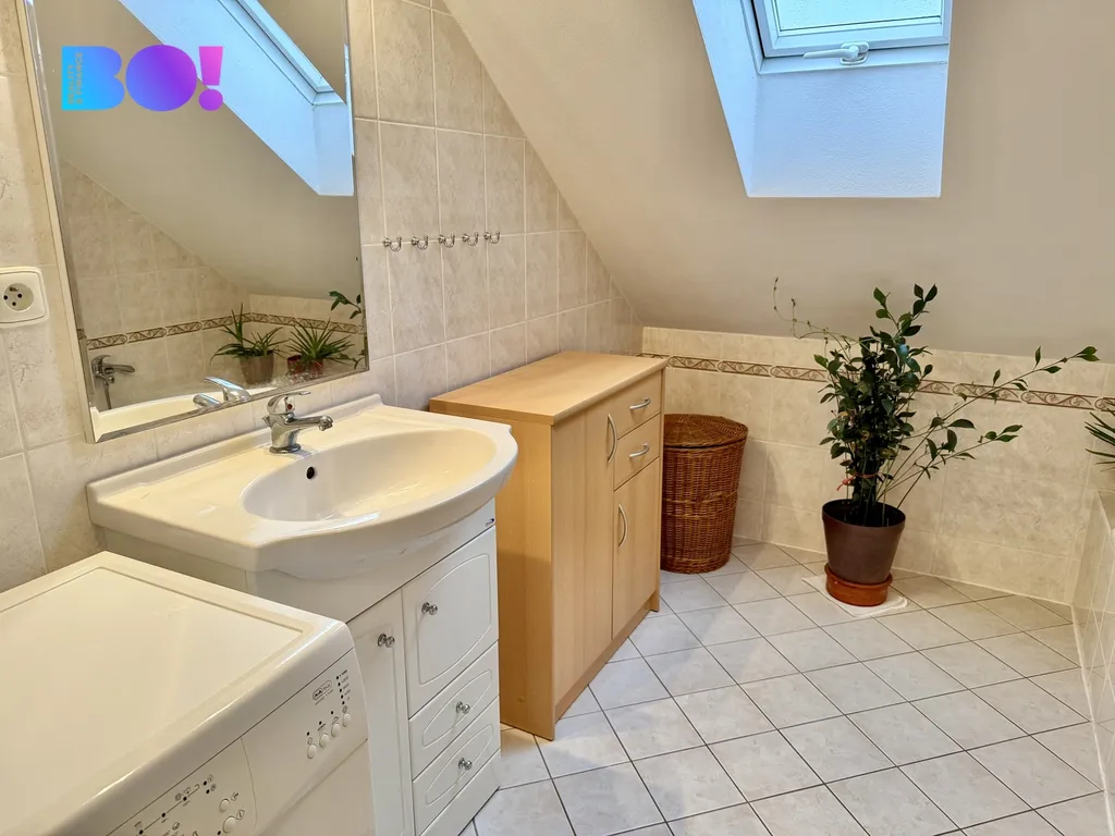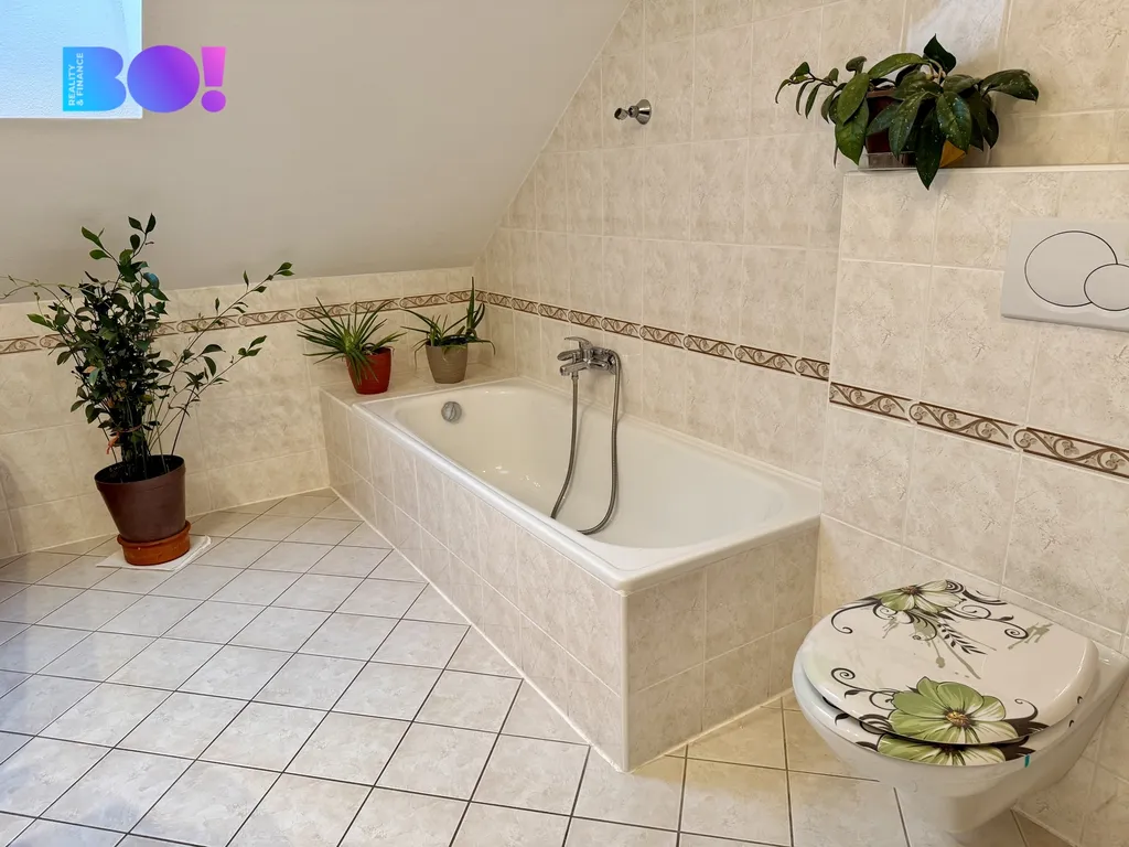 V prvním patře domu jsou čtyři pokoje, komora, chodba, koupelna s vanou a WC.