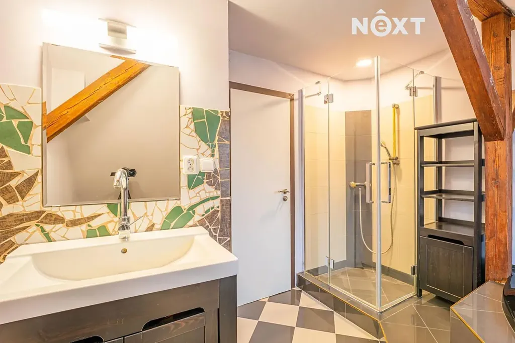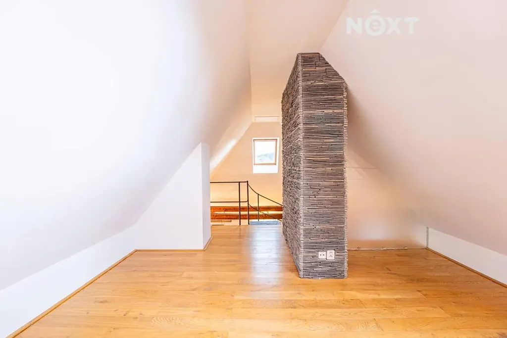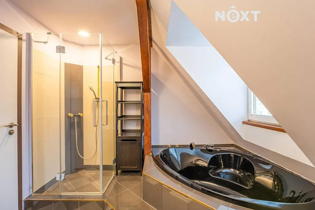 Byt s podlahovou plochou 83 m2 se nachází v 3.NP (nejvyšším patře) cihlového domu v klidné lokalitě blízko centra města. Chodba, v níž se nachází vestavěná skříň se zrcadlem, je průchozí do všech místností. V koupelně najdete sprchový kout i vanu, umyvadlovou skříňku se zrcadlem a prostor na pračku. WC je zvlášť. Část obývacího pokoje tvoří na míru vyrobená kuchyňská linka s vestavěnými spotřebiči jako je varná deska, elektrická trouba a myčka. Z něj vystoupáte do patýrka nebo vyjdete na balkon.