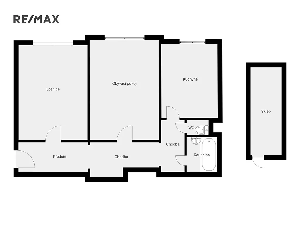 Dispozice nyní sestává ze dvou neprůchozích pokojů, samostatné kuchyně, koupelny s vanou, odděleného WC a vstupní chodby.
