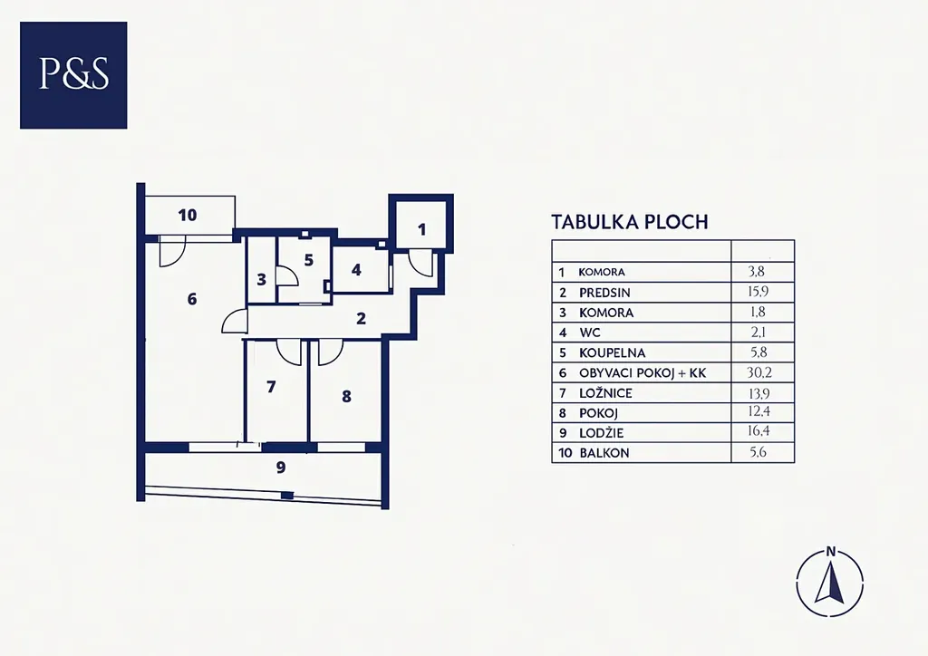 Dispozici bytu tvoří velkoryse pojatý obývací pokoj (30 m²), dvě ložnice (14 m² a 12 m²), koupelna se sprchovým koutem a WC (6 m²), dvě komory (4 m² a 2 m²), WC (2 m²), předsíň (16 m²), balkon (7 m²) a lodžie (16 m²).