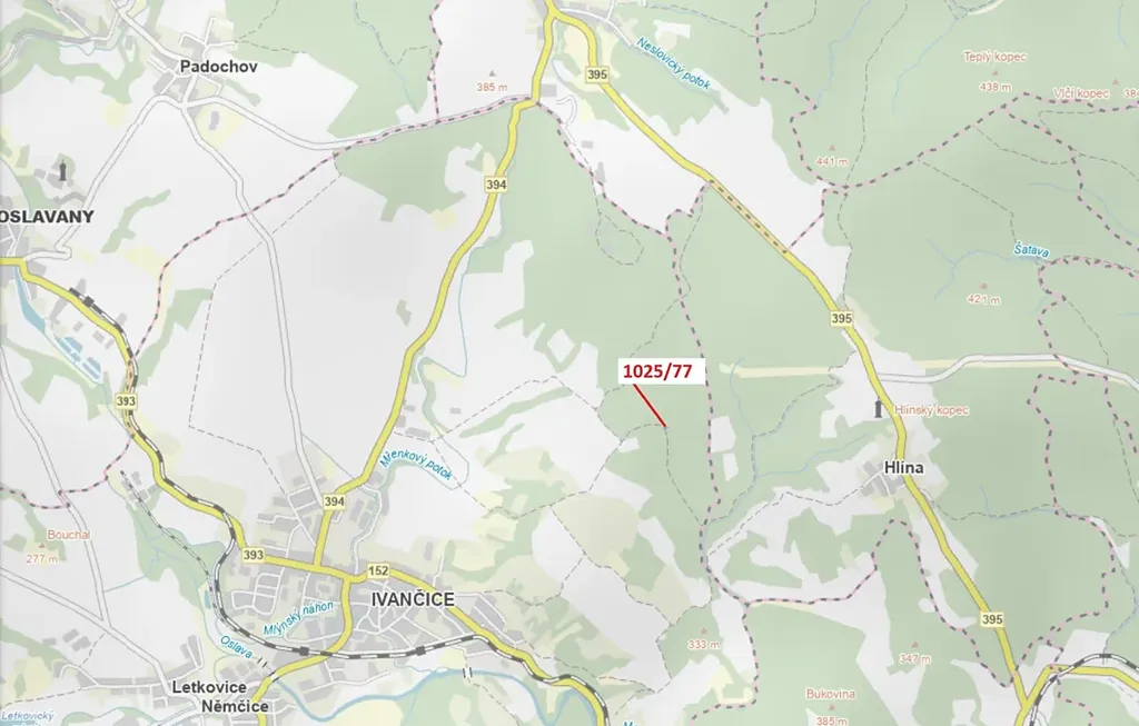 Lesní pozemek o výměře 140 m2, parcelní číslo 1025/77, podíl 1/1, katastrální území Kounické Předměstí, obec Ivančice, obec s rozšířenou působností Ivančice, okres Brno-venkov, Jihomoravský kraj.