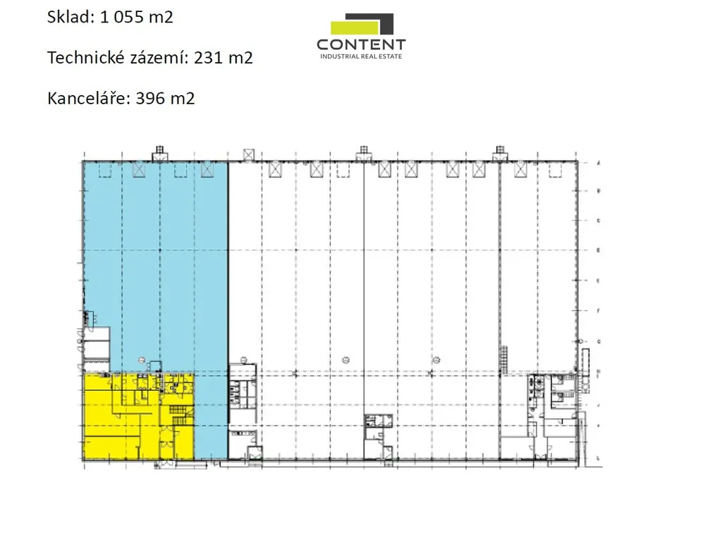 - skladový prostor 1055 m² + technické zázemí 231 m² + kanceláře a sociální zázemí / showroom 396 m²,