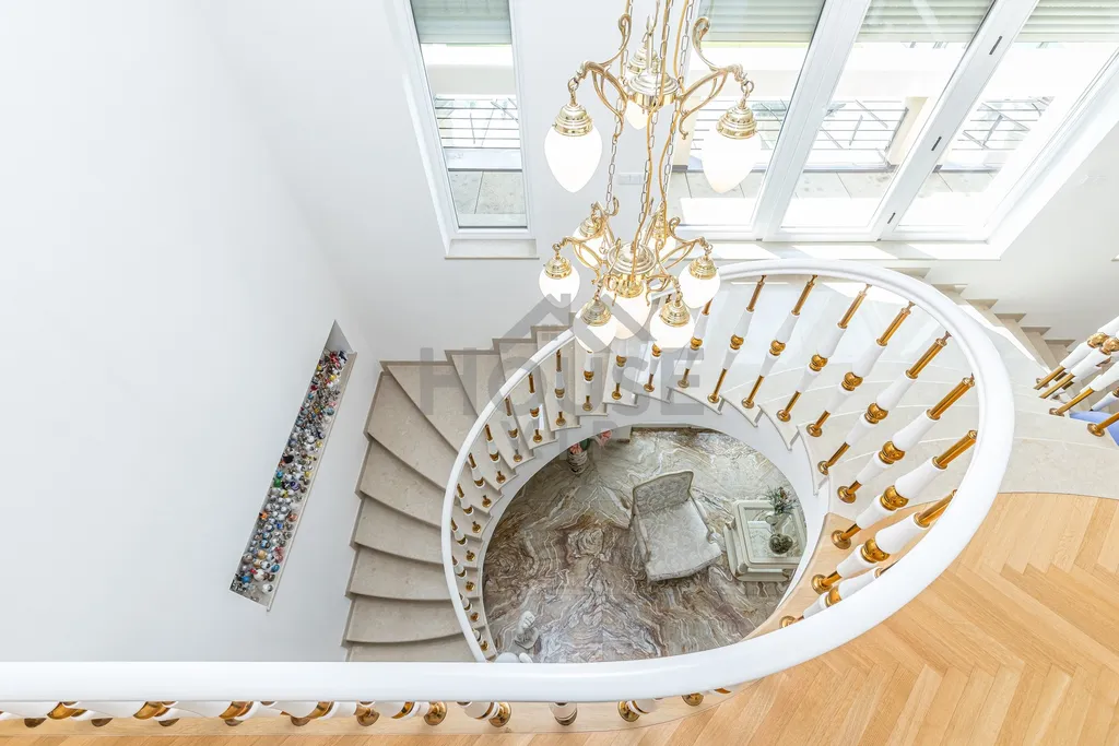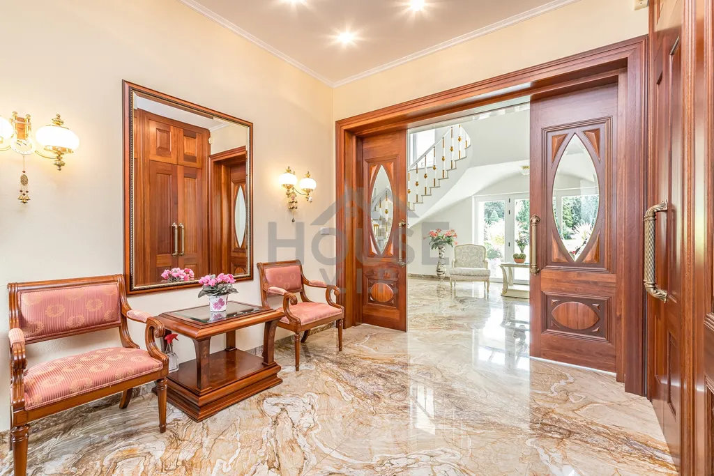 V přízemí domu se nachází velká vstupní hala se vstupem do prostorné šatny. Posuvnými inkrustovanými dveřmi se vchází do velké nádherné haly s mramorovým schodištěm do horního patra a přístupem do krásné zahrady, v obou místnostech jsou úžasné mramorové podlahy.